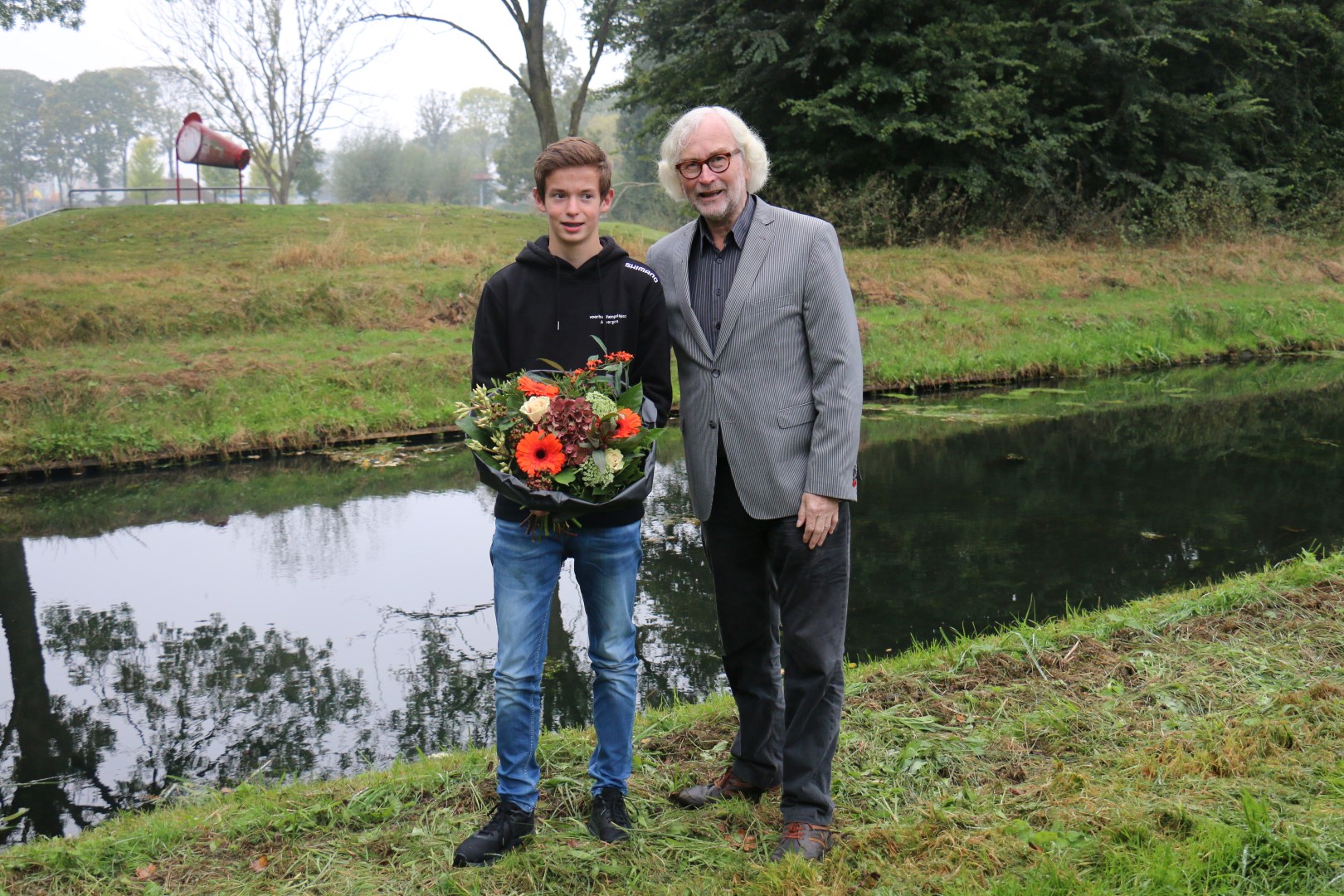 Voorzitter Jan Telleman feliciteert de Nederlands Kampioen Zoetwatervissen U15 Tim Rijsdijk |