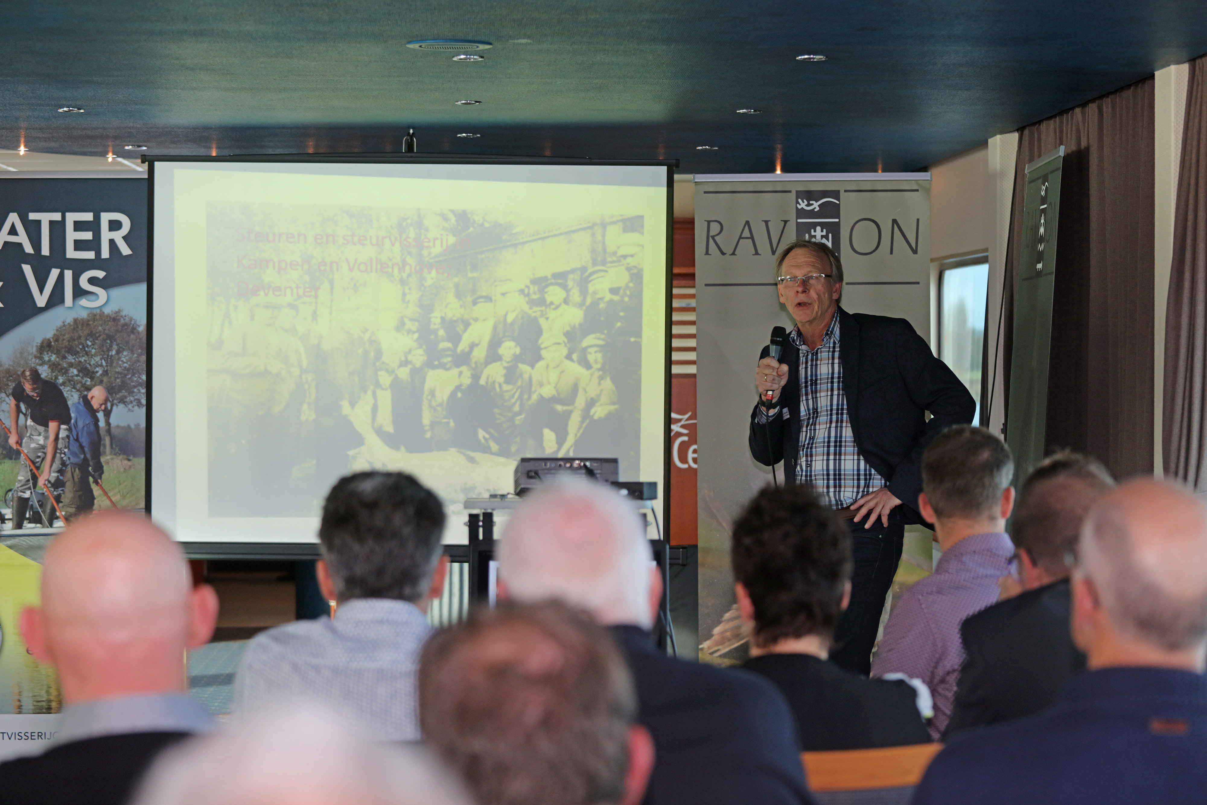 | Ed Piek benadrukt de goede samenwerking met Martijn Schiphouwer van RAVON | | Jaap Quak (SVN) geeft een overzicht van de ontwikkeling van de visserij, de visstand, waterkwaliteit en vismigratie door de jaren heen |