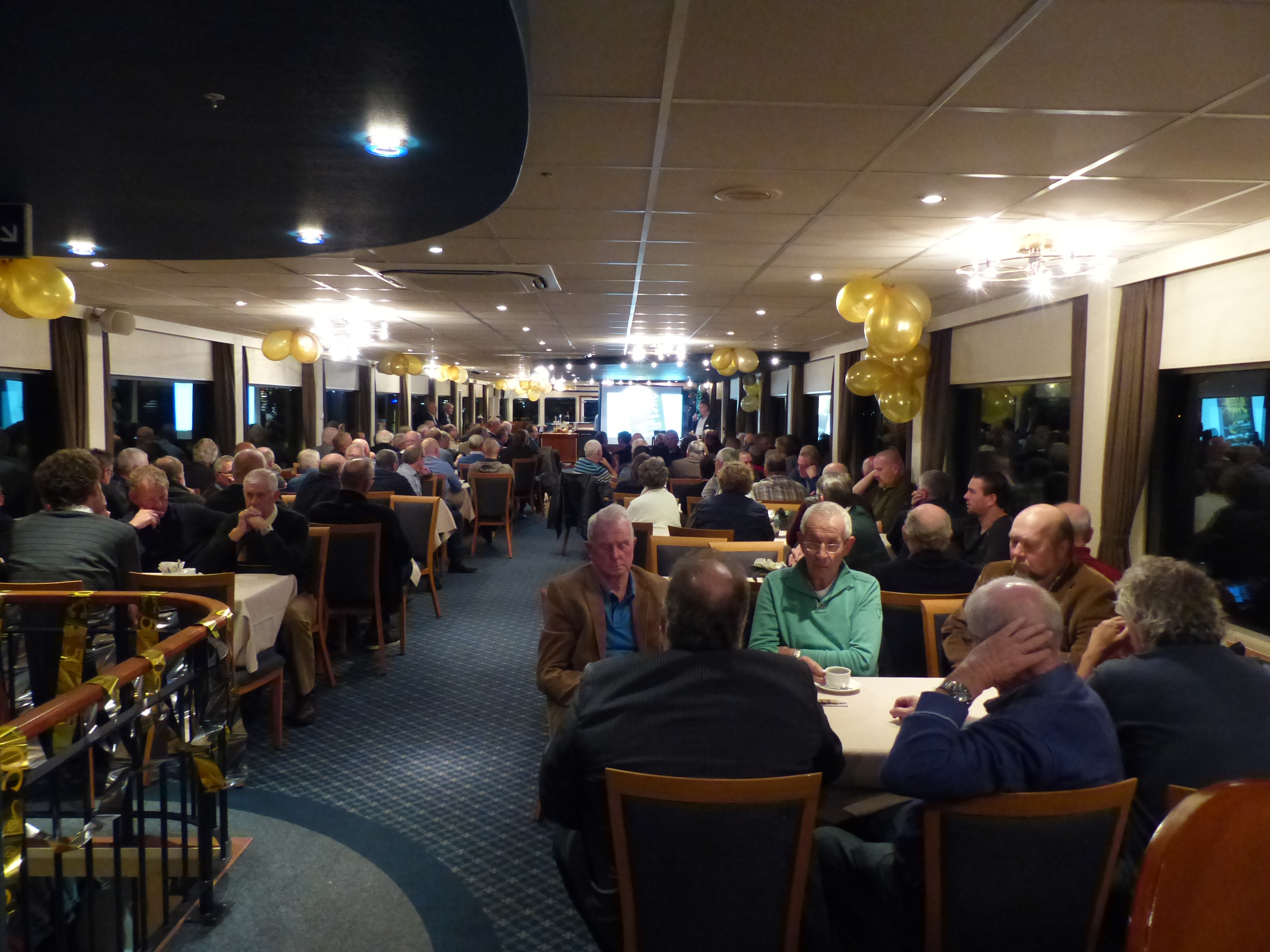 ’s Avonds waren de weergoden ons wat minder goed gezind dan overdag, maar omdat het schip aangemeerd bleef liggen, bleef dat voor velen onopgemerkt tot het moment dat men weer voet aan wal zette. Voor het avondprogramma waren onze vrijwilligers, alle aangesloten hengelsportverenigingen en andere hengelsportorganisaties uitgenodigd. Tijdens toespraken van enkele bestuurders uit verschillende hengelsportorganisaties en de directeur Ed Piek werd ingegaan op 50 jaar hengelsport en met name de kracht van onze vrijwilligersorganisatie.