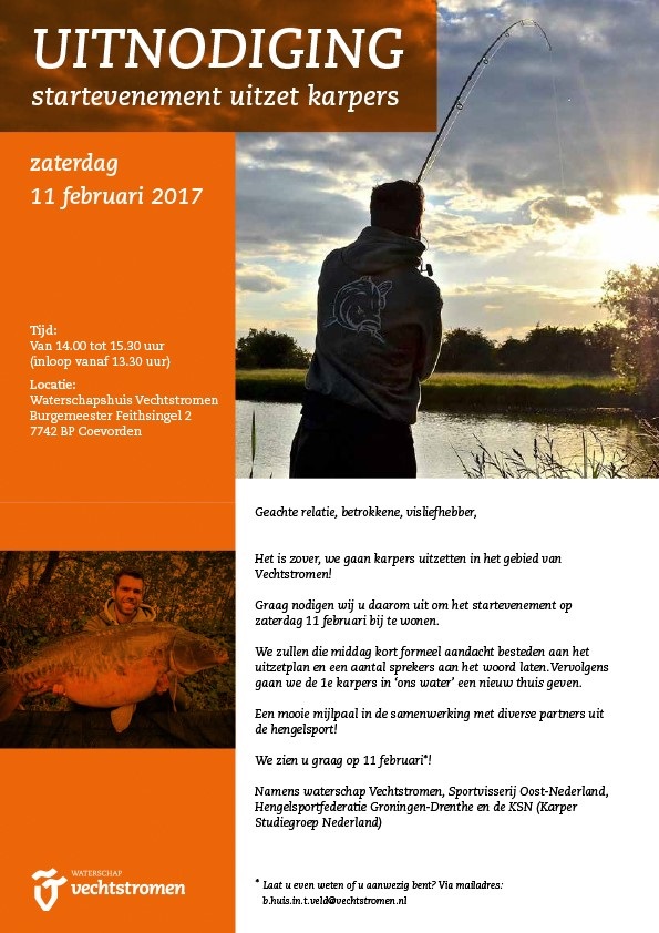 Het is zover! Op zaterdag 11 februari gaat waterschap Vechtstromen, samen met Sportvisserij Oost-Nederland, Hengelsportfederatie Groningen – Drenthe en de KSN (De Karper Sportvisserij Nederland) karpers uitzetten in het gebied van Vechtstromen. Het waterschap werkt hieraan mee, omdat het karperbestand zichzelf niet in stand kan houden. Ook komt het waterschap hiermee aan de wens van vele hengelsportliefhebbers tegemoet om in de grotere kanalen zo nu en dan een karper te kunnen vangen.