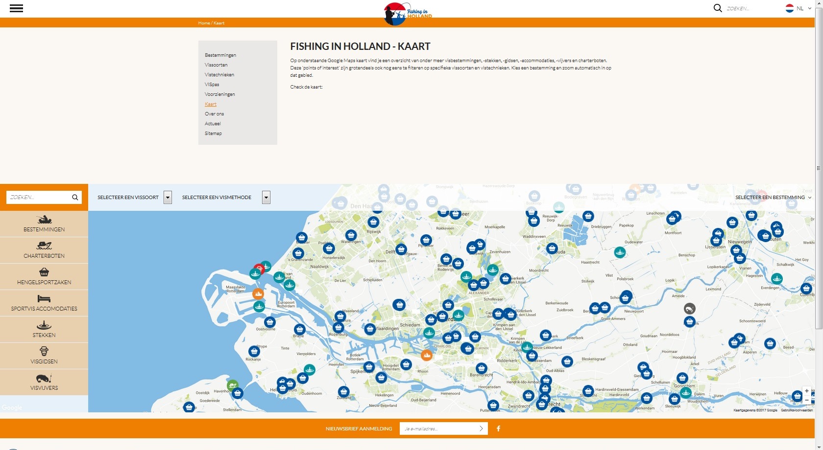 Sportvisserij Nederland heeft www.fishinginholland.nl gelanceerd: dit is hét vertrekpunt voor een vistrip in eigen land. Hier vind je de gaafste bestemmingen en beste accommodaties voor de sportvisser – of je nu met je vismaten eropuit wilt of met het hele gezin op vakantie gaat. Laat je inspireren door wat Nederland op hengelsportgebied allemaal te bieden heeft!