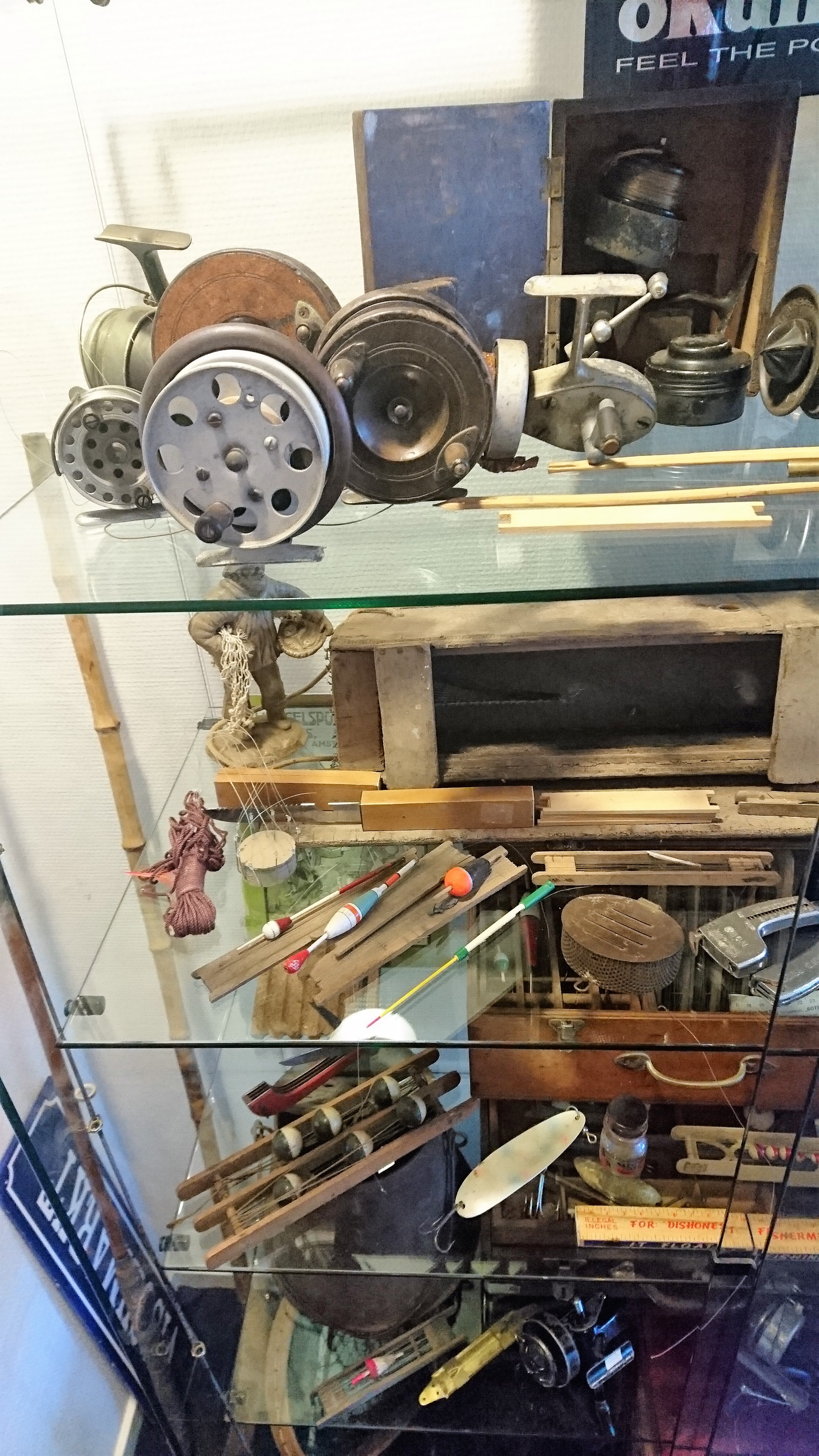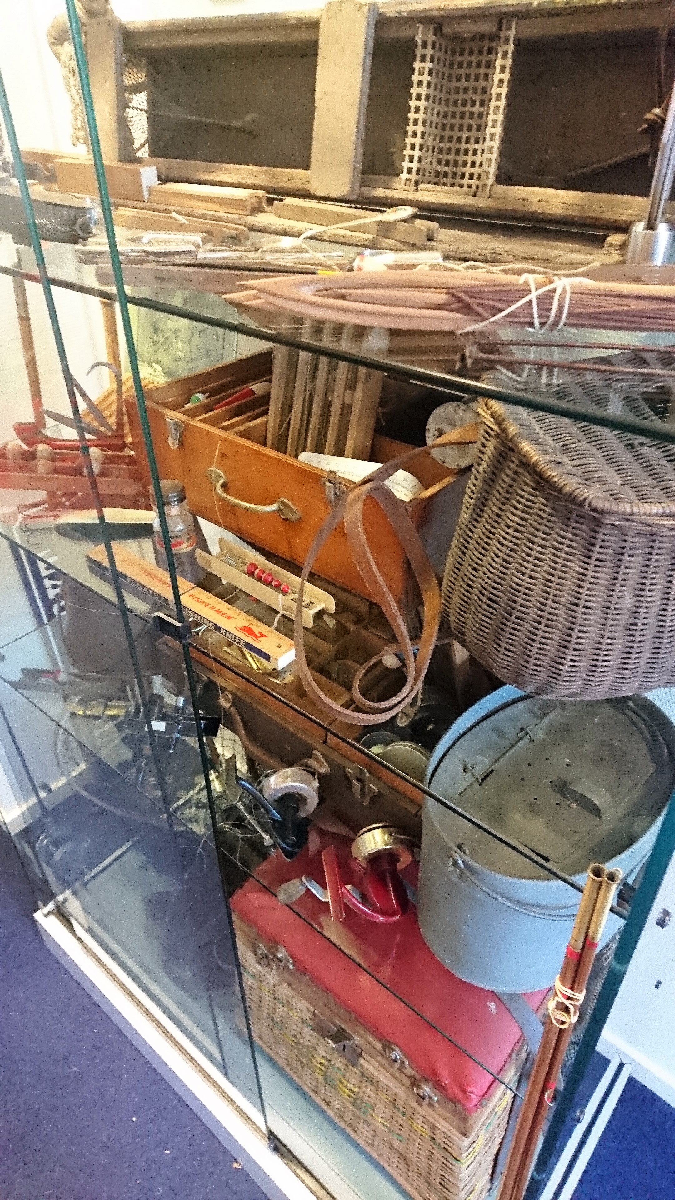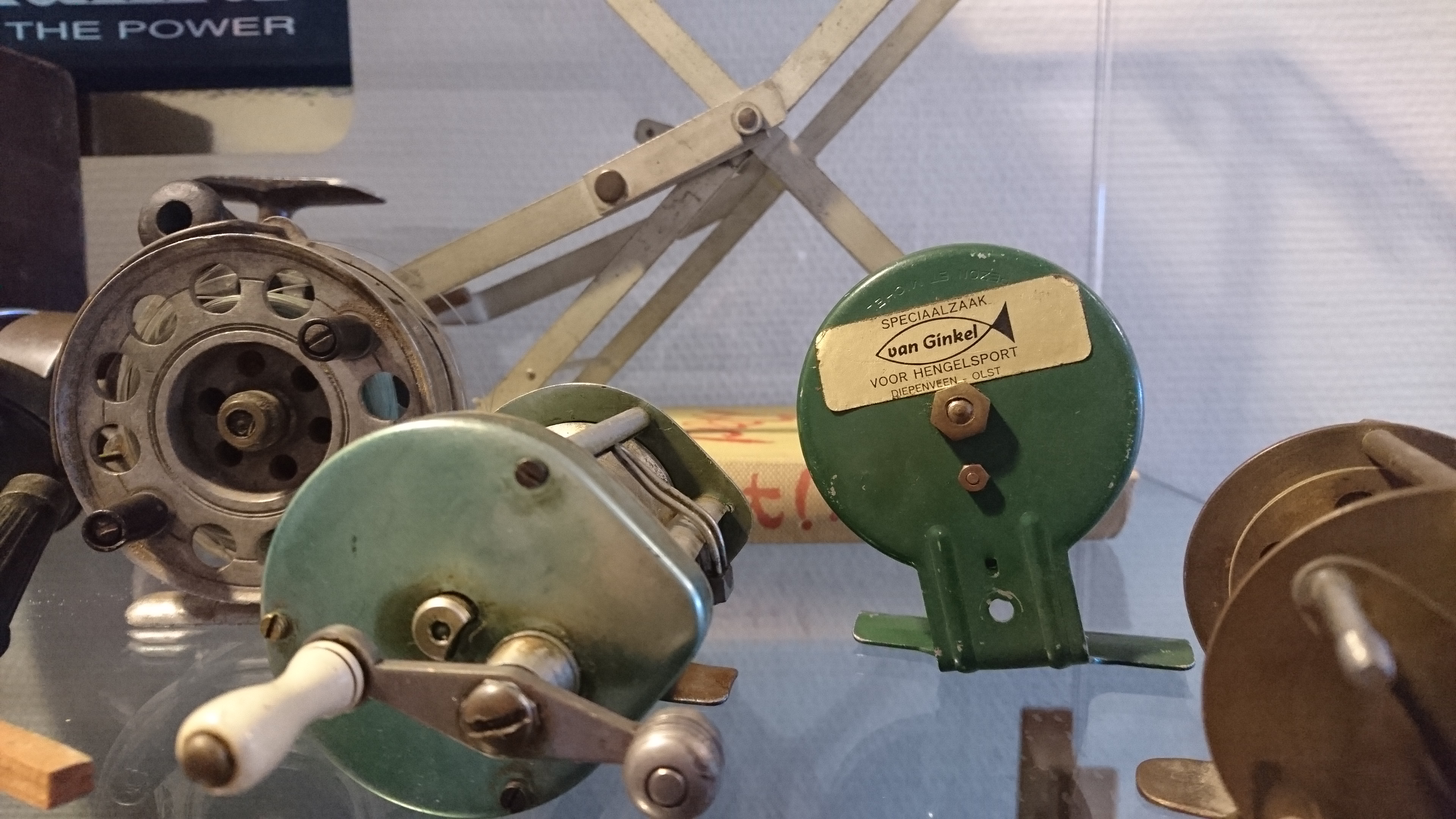Een complete verzameling unieke hengelsportmaterialen prijkt in een vitrinekast in de hal van ons kantoor.