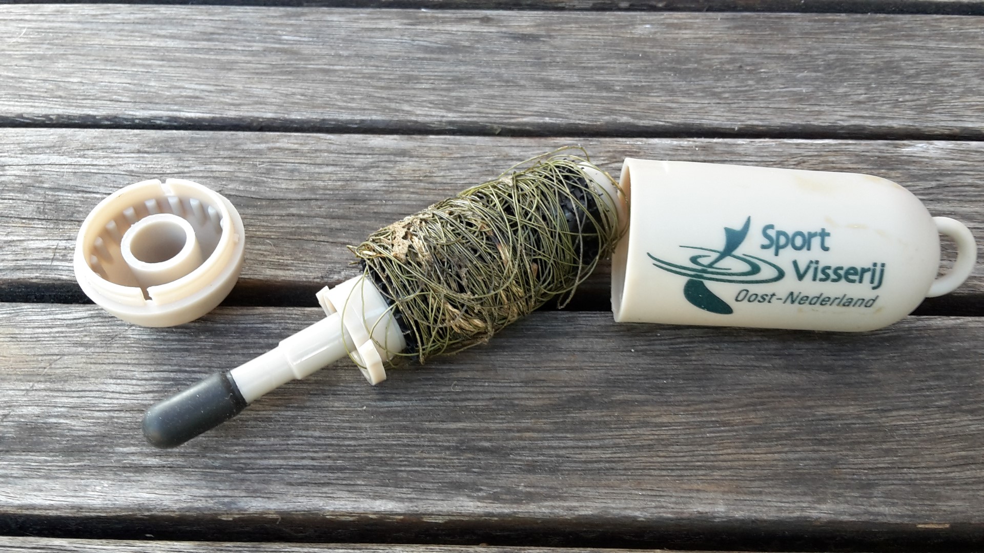 Restjes vislijn, maar ook vele meters draai je gemakkelijk in de Monomaster. Eenmaal thuis knip je de lijn los en gooi je het in de afvalbak |