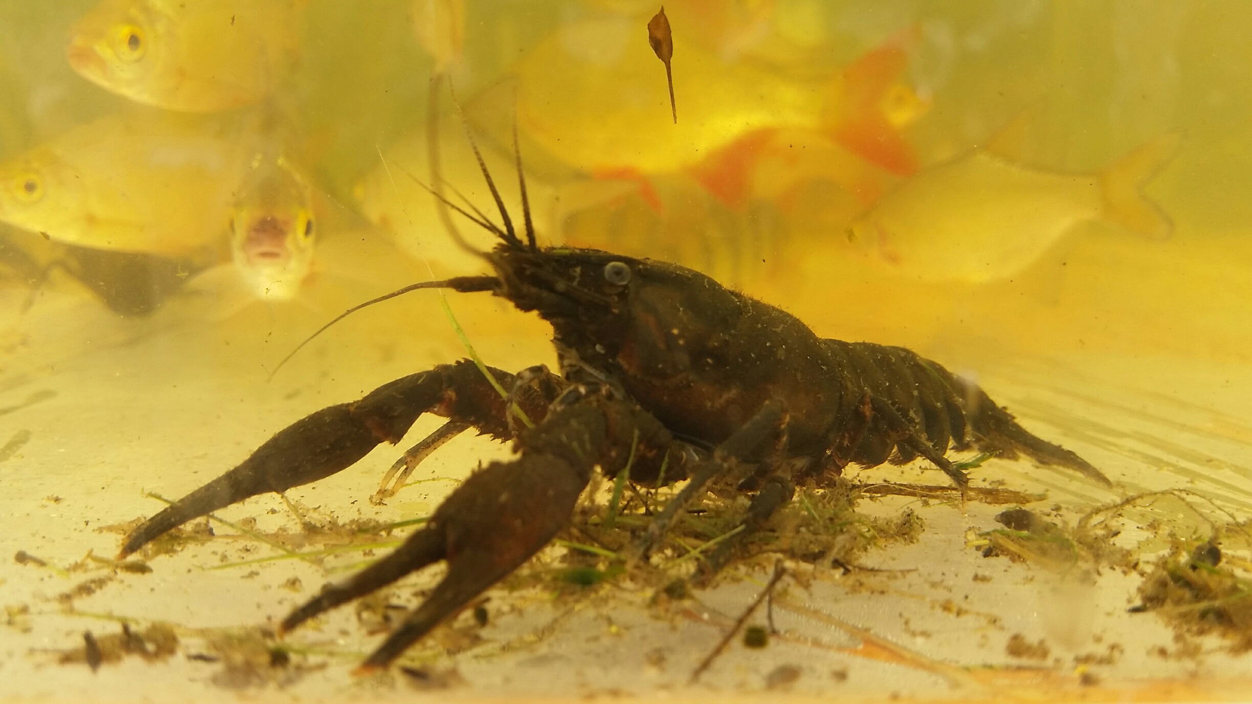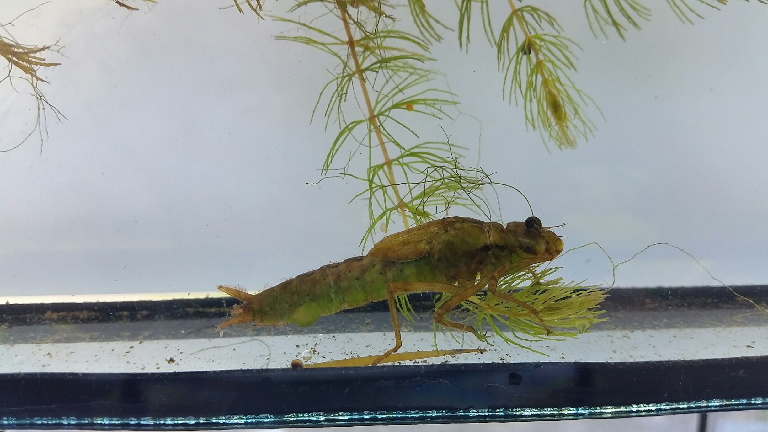 | Een Libelle larve, Amerikaanse rivierkreeft en een mini snoekje in de aquaria |