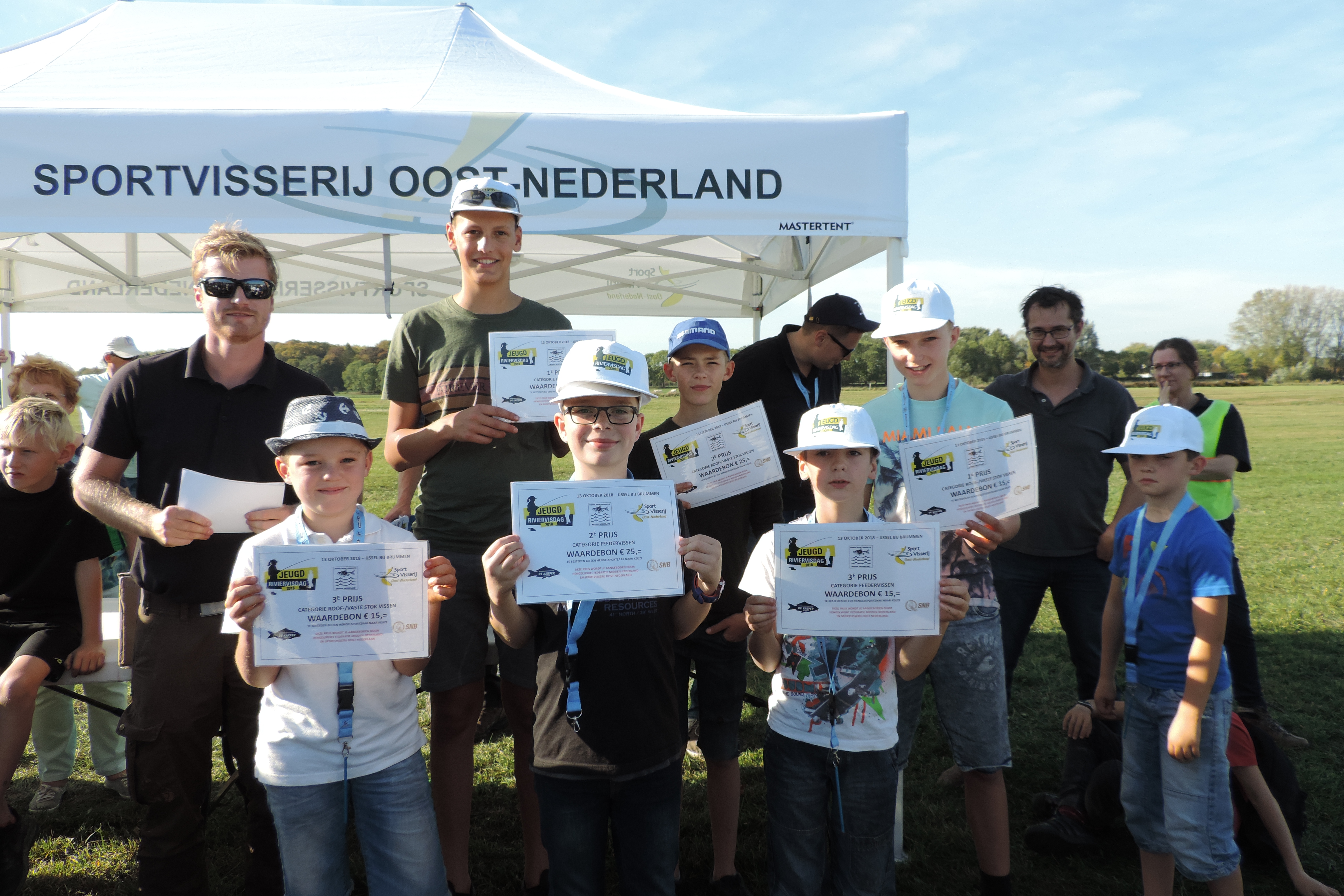 De prijswinnaars met hun waardebonnen om mooie visspullen te kopen