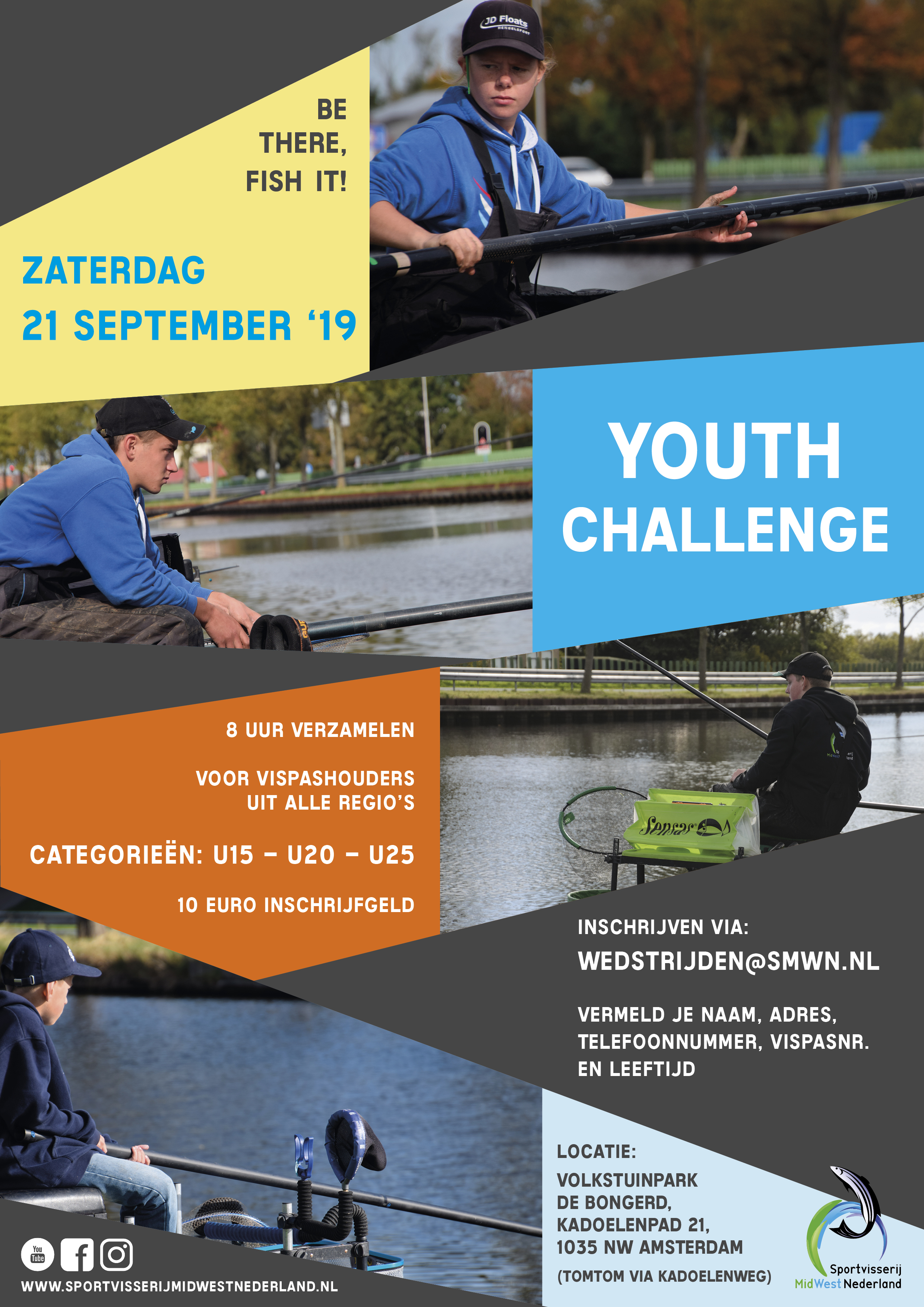 Op zaterdag 21 september 2019 organiseert Sportvisserij MidWest Nederland haar Youth Challenge wedstrijd. Deze wordt gevist in het volkstuinpark de Bongerd te Amsterdam. Dit zorgt niet alleen voor een spannende wedstrijd, maar biedt ook meteen een ideale training voor de 3e en 4e Evezet Top Teamcompetitie wedstrijden Dames en U20 2019 die een week later worden gevist in het Noordhollands Kanaal in Purmerend.