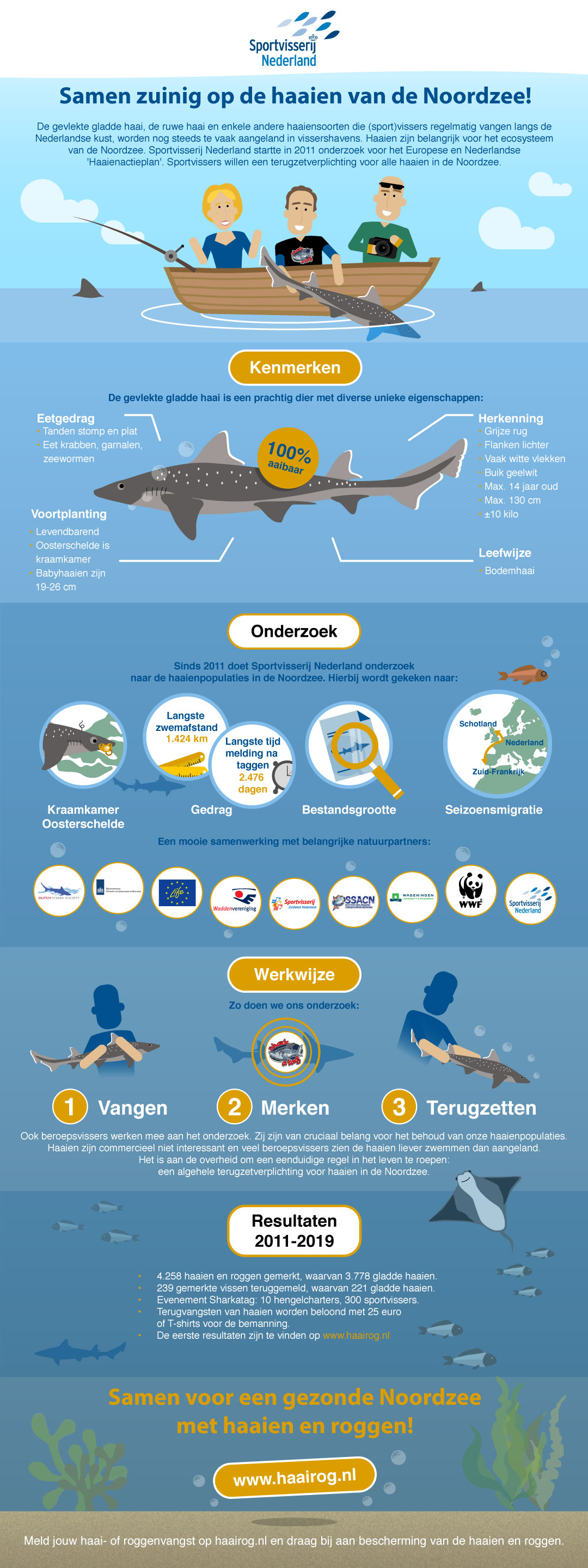 Mede dankzij de geslaagde, laatste Sharkatag-editie van afgelopen zomer weten we meer van de gevlekte gladde haai dan ooit. Sportvisserij Nederland heeft de meest interessante bevindingen over dit prachtige dier – zijn menu, gedrag, zwemroutes etc. – nu ook samengebracht in een fraaie infographic.