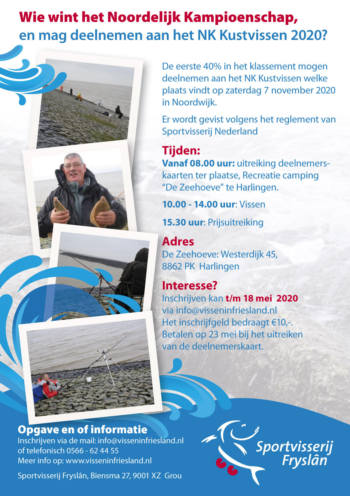 Naast het verdelen van de mooie prijzenpot, mag de eerste 40% in het klassement deelnemen aan het NK Kustvissen welke plaats vindt op zaterdag 7 november 2020 in Noordwijk.