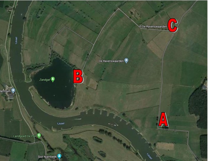 parkeerplaats De Ravenswaarden, Bruggeweerdsedijk 7213, 7213 DX Gorssel (in de kaart aangegeven met een C), waarvandaan het een behoorlijk stuk lopen is naar de IJssel.