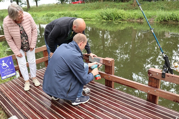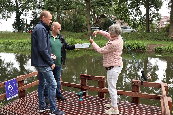 Zo’n 25 belangstellenden kwamen woensdagmiddag bijeen bij de Schipbeek in Bathmen. Nadat Gé Duchatteau, voorzitter van rayon 2, mooie herinneringen aan Henk had opgehaald, was het de eer aan Gido en Emiel Koeslag om de naar hun vader vernoemde vissteiger officieel te openen. Henks echtgenote Beppie knipte het naambordje los van een opgestelde hengel en beide zoons schroefden het bordje vast op de steigerbalustrade. Vol trots en dankbaarheid sprak Beppie een woord van dank uit naar alle aanwezigen en iedereen die heeft bijgedragen aan de realisatie van de vissteiger.