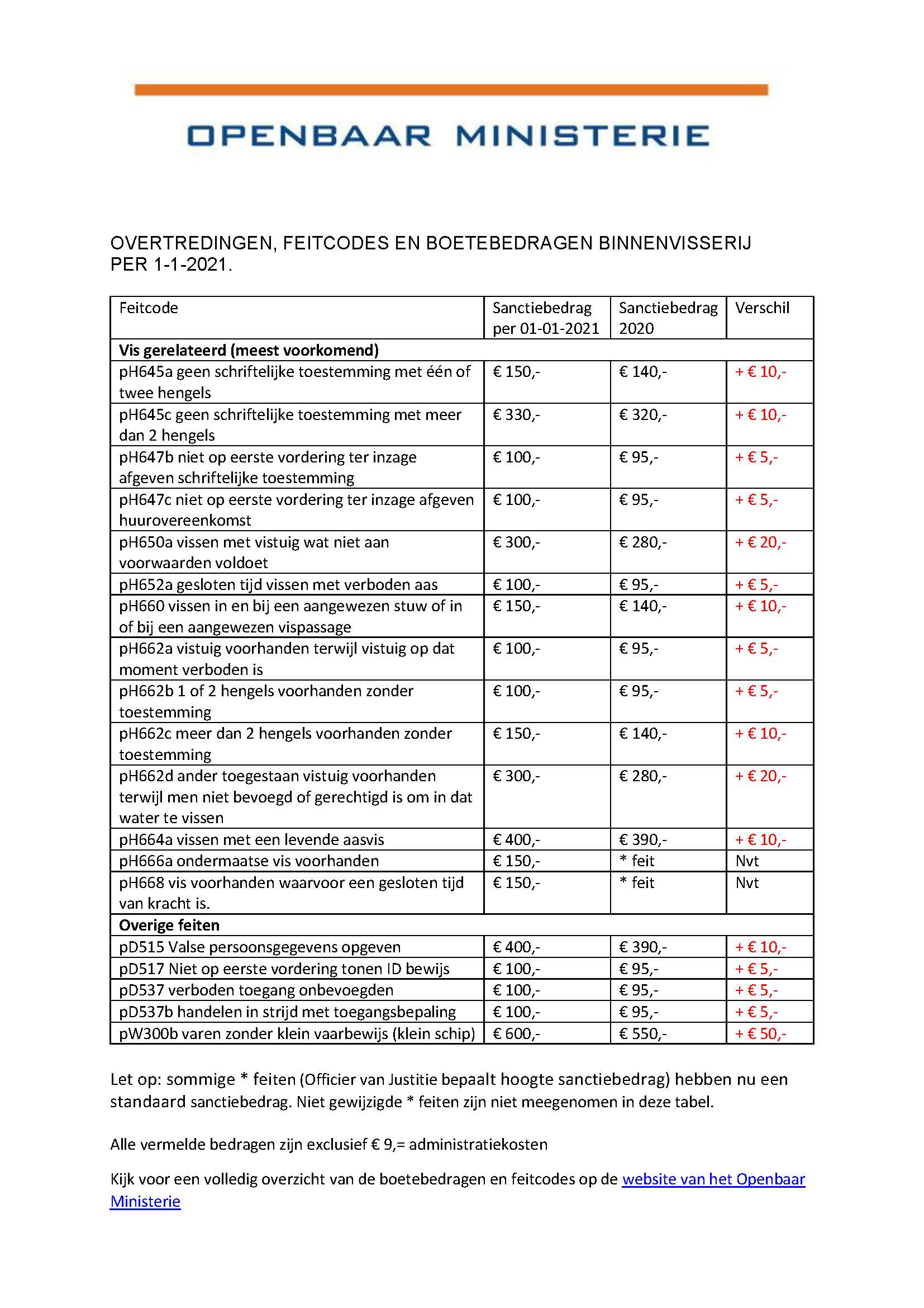 Jaarlijks bepaalt het Openbaar Ministerie de hoogte van de boetebedragen voor overtredingen in de binnenvisserij. Met ingang van 1 januari 2021 zijn voor alle veel voorkomende strafbare feiten de boetebedragen verhoogd. We hebben de bedragen behorende bij de meest voorkomende visgerelateerde overtredingen en enkele overige feiten voor je in een overzicht gezet.