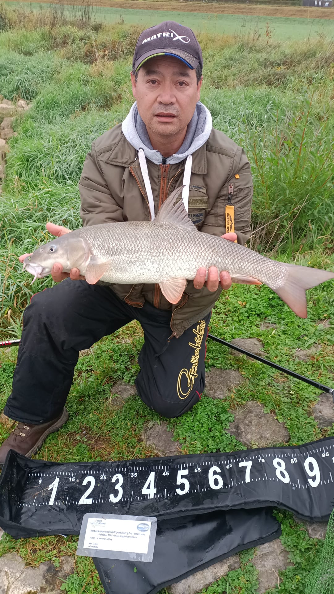 Nadat om 15.00 uur het sein om te stoppen klonk, kon de balans opgemaakt worden. Hieruit bleek dat er 3 barbelen zijn gevangen van respectievelijk 68, 67 en 65 cm, goed voor de eerste, tweede en derde plek dus. Ook zijn er nog 2 kleine barbelen van 12 cm gevangen. Hierna kon het grote rekenwerk gebeuren, namelijk het optellen van de totale lengte in centimeters van de andere gevangen vissoorten per koppel.