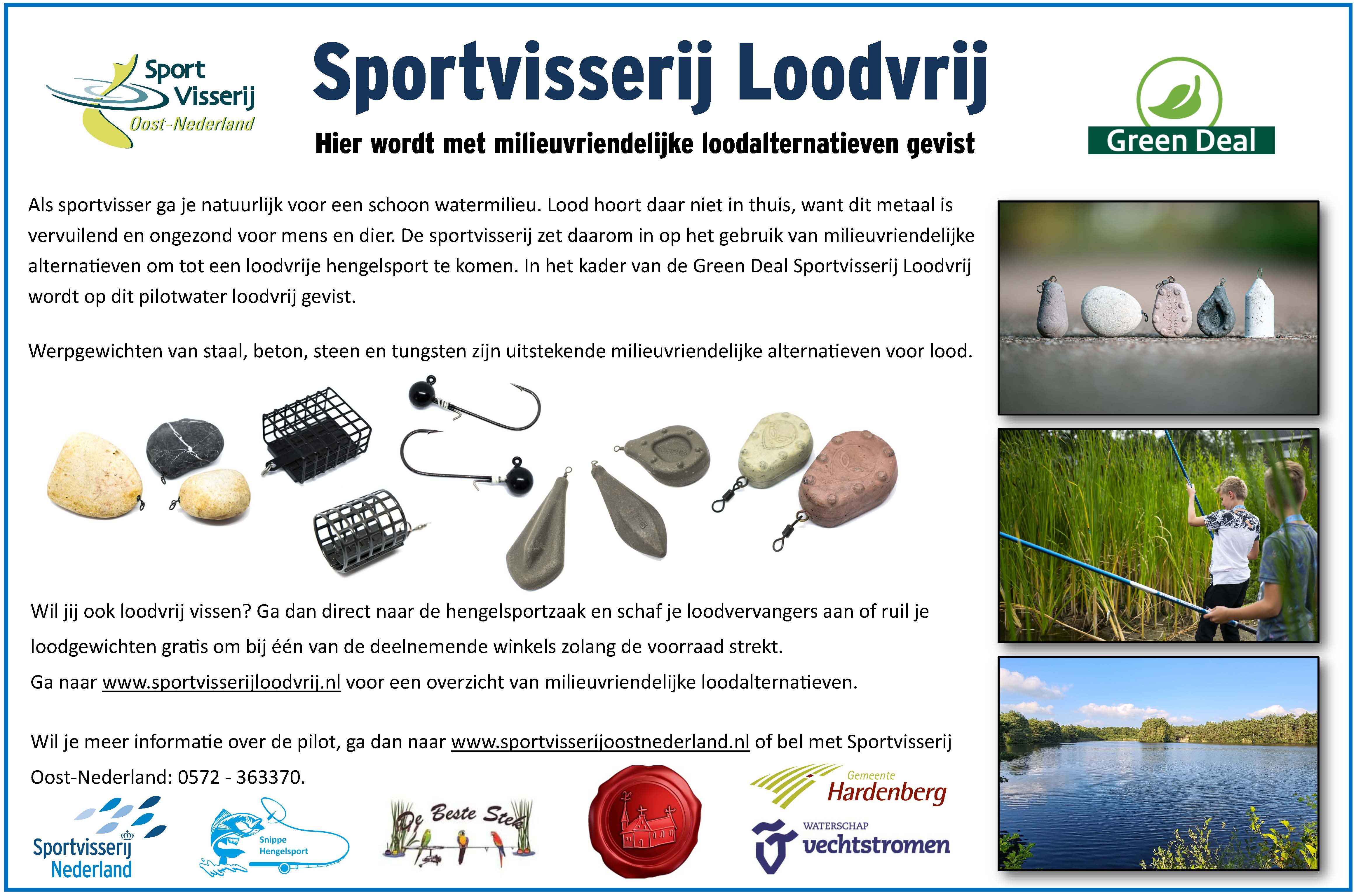 In het kader van de Green Deal zijn we samen met Waterschap Vechtstromen van start gegaan met de Campagne Sportvisserij Loodvrij Vechtstromen. Binnen deze pilot zijn voor het gehele werkgebied van Waterschap Vechtstromen vanaf 16 december de Christinalustvijver te Enschede en de Spartelvijver nabij Sibculo aangewezen als loodvrij viswater. Om sportvissers te stimuleren loodvrij te vissen, hebben we ook een drietal inruilacties, waarbij je je oude lood gratis kunt ruilen tegen loodvrije alternatieven.