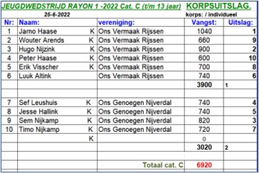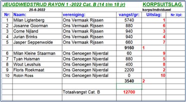 Op zaterdag 25 juni 2022 werd onder uitstekende weersomstandigheden door Rayon 1, in samenwerking met Ons Vermaak te Rijssen de jaarlijkse Korpswedstrijd Junioren cat. B (U20) en C (U15) gevist.