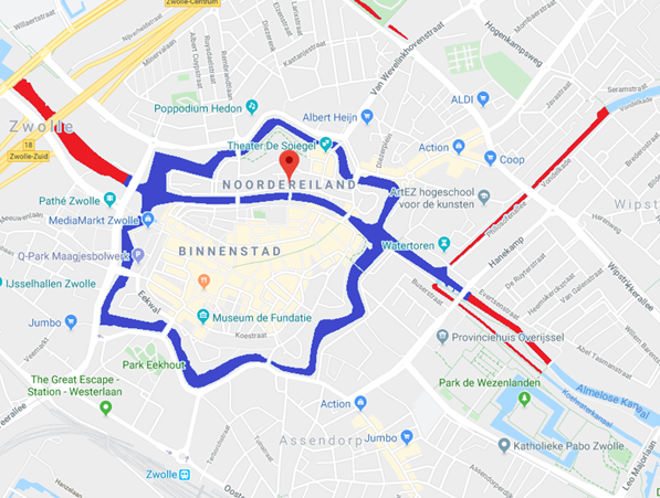 De selectiewedstrijd streetfishing vindt plaats in de binnenstad van Zwolle. Het parkoers is hieronder weergegeven. Doordat de selectiewedstrijd hier gehouden wordt is het helaas niet mogelijk om gebruik te maken van de wateren binnen dit wedstrijdparkoers, dit betreft dus alle donkerblauwe wateren.