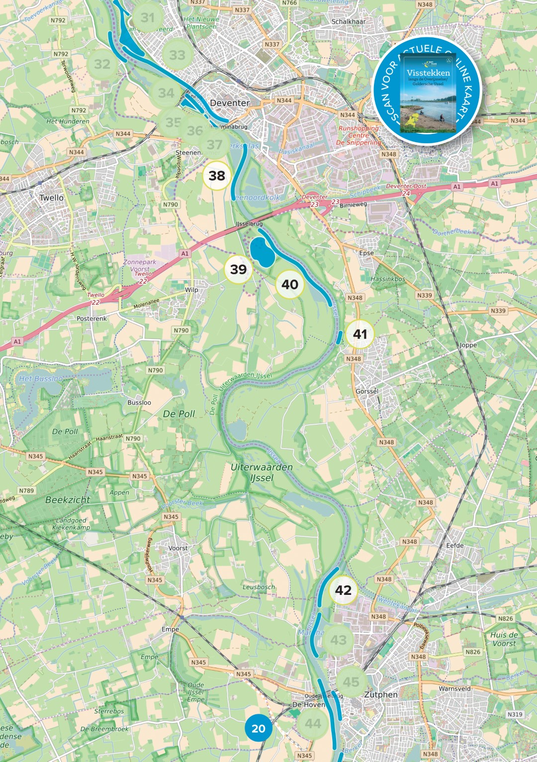 Natuurlijk zijn er nog veel meer mooie visstekken langs de IJssel te vinden. Deze stekken kun je vinden op de digitale versie. Hierin zijn ook stekken opgenomen waarbij je lid moet zijn van een lokale hengelsportvereniging. Op elke deelkaart in het boekje vind je een QR code naar de digitale kaart. De digitale kaart zal indien nodig steeds geactualiseerd worden.