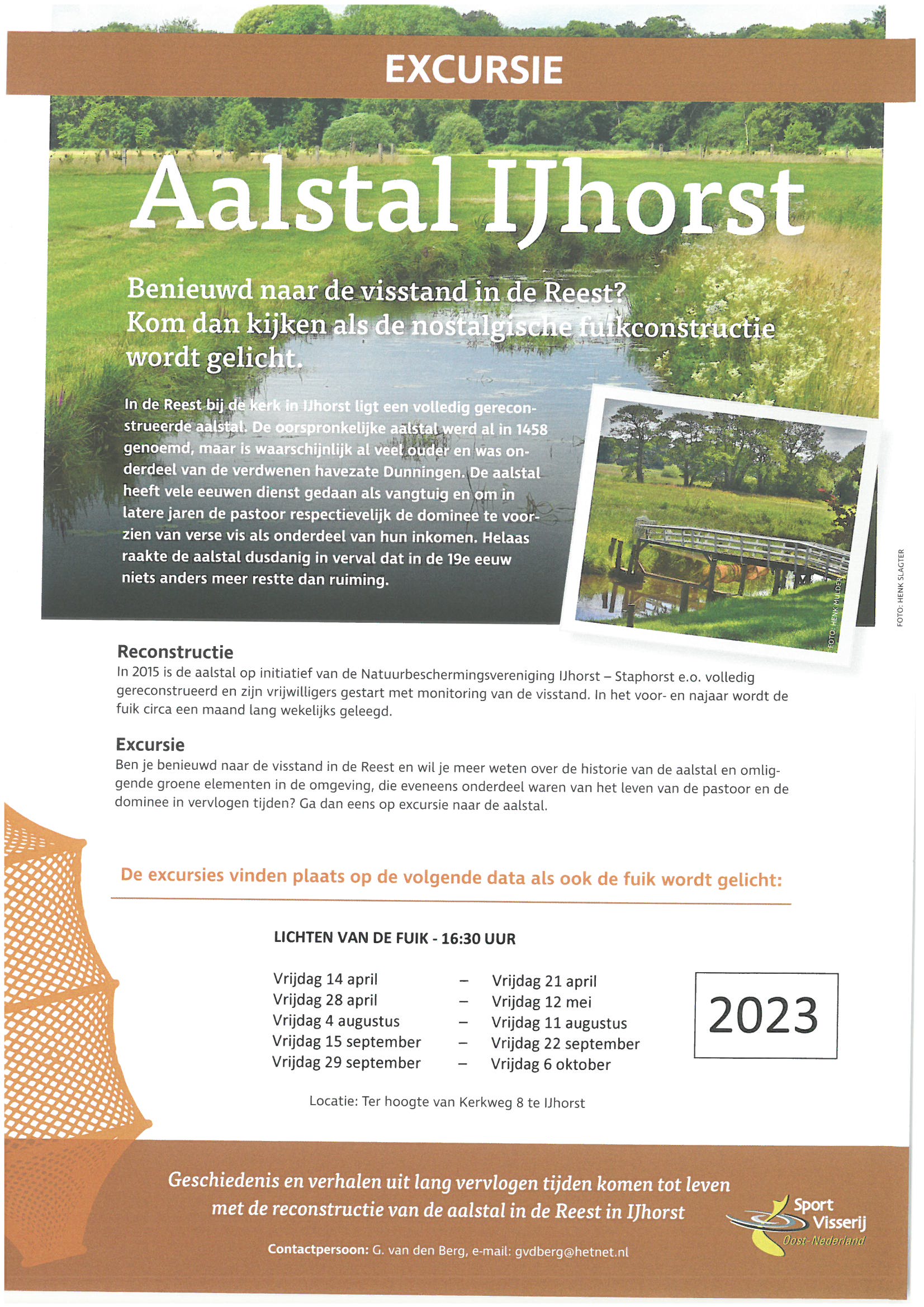 Om het historische belang en concept van de aalstal onder een breder publiek kenbaar te maken, gaan vrijwilligers van Sportvisserij Oost-Nederland (uit de omgeving IJhorst) ook de komende maanden weer zomerexcursies organiseren voor een breed publiek. Zo hopen we mensen een korte, leuke en informatieve excursie te geven met aandacht voor een stukje geschiedenis en een demonstratie van werking van het vangtuig. Hopelijk komen er mooie vissen boven water wanneer de fuiken worden gelicht!