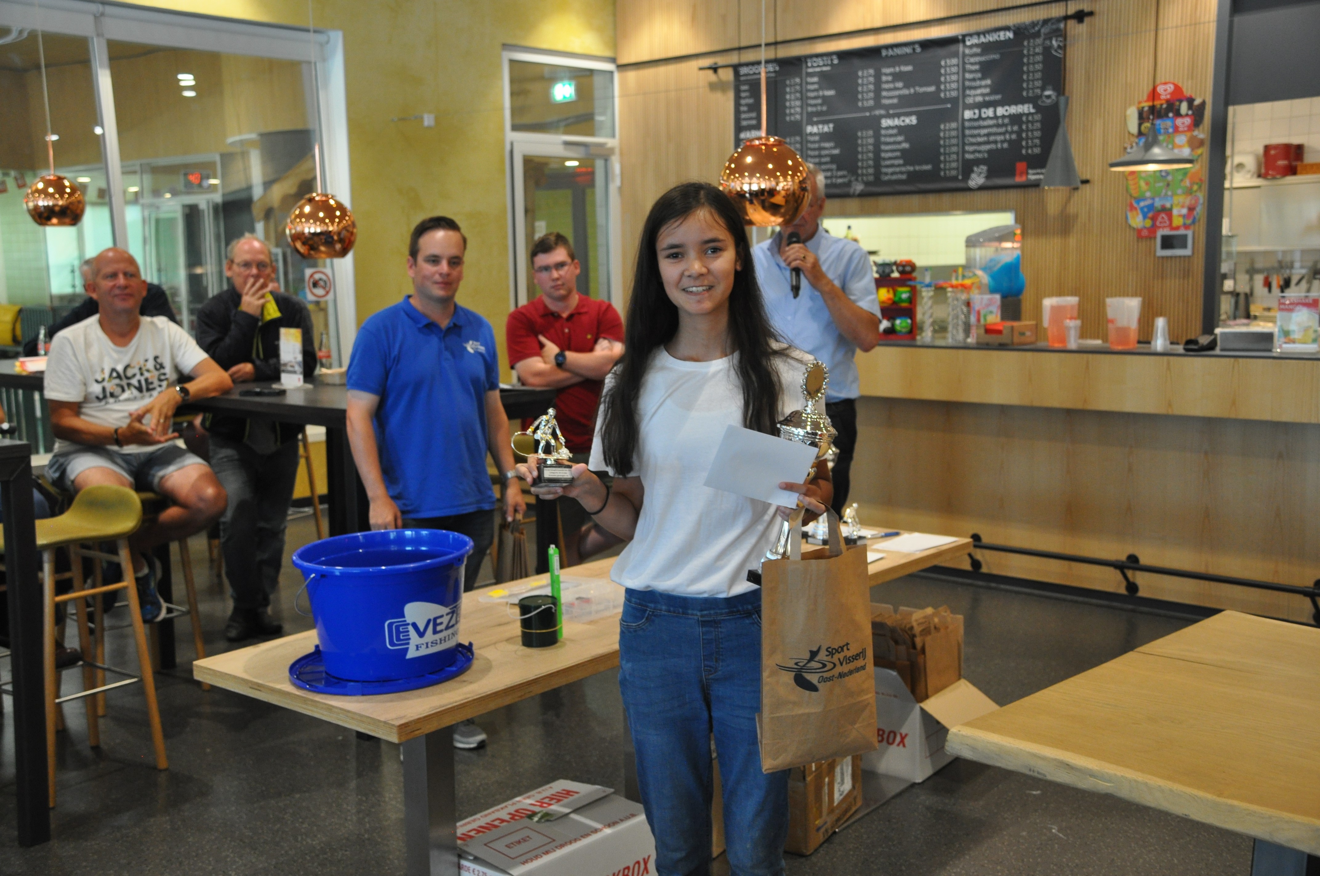 Na afloop werd de prijsuitreiking gehouden in de prachtige locatie bij het zwembad De Tijenraan, waar iedere deelnemer kon genieten van een heerlijke bordje patat met limonade. Daarna werd de uitslag bekend gemaakt, waarbij de in jongste categorie iedereen een prijs kreeg. Ook kregen alle vissers een goodybag, die hen werd aangeboden namens Sportvisserij Oost-Nederland.