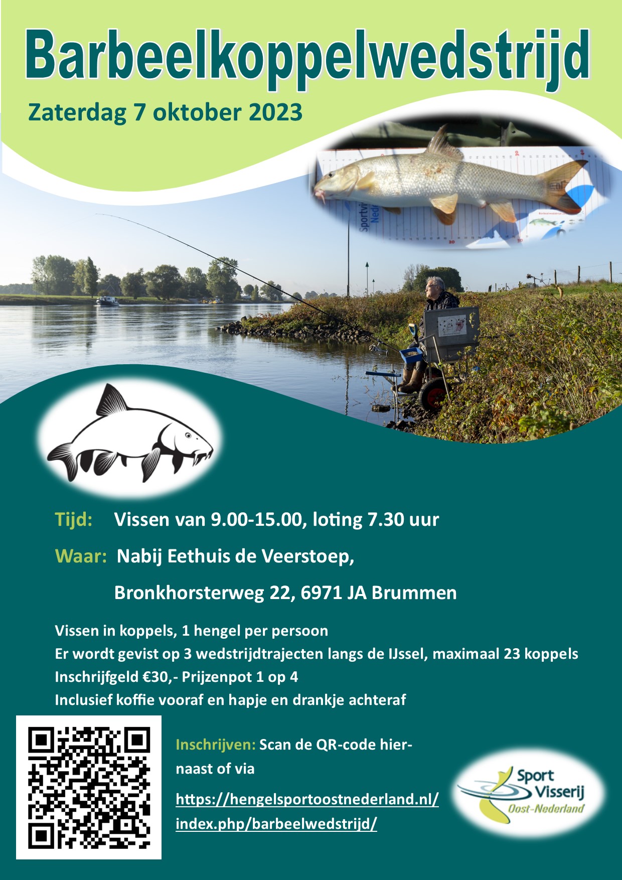 Na de geslaagde voorgaande edities staat ook dit jaar de Barbeel Koppelwedstrijd weer gepland! Op zaterdag 7 oktober a.s. vindt in de IJssel de barbeel koppelwedstrijd plaats. Bij deze koppelwedstrijd zijn mooie geldprijzen te winnen, maar de gezelligheid staat voorop. Bij deze ben je van harte uitgenodigd om mee te doen aan dit unieke evenement!