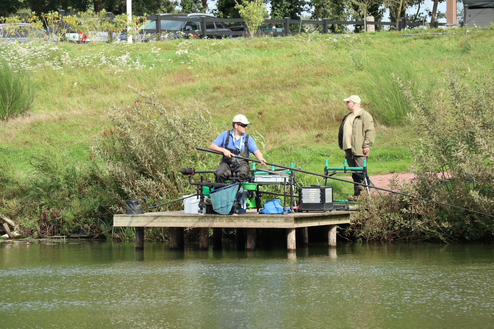Terwijl de ene groep een hengeltje uitgooide, liep de andere groep een leuke klootschietroute in de directe omgeving van het vispark. Op die manier raakte men lekker met elkaar in gesprek en werden nieuwe leuke contacten gelegd. Op de vissteigers was het niet anders, veel vrijwilligers installeerden zich met z'n tweeën op een steiger, wat de gezelligheid alleen maar ten goede kwam.
