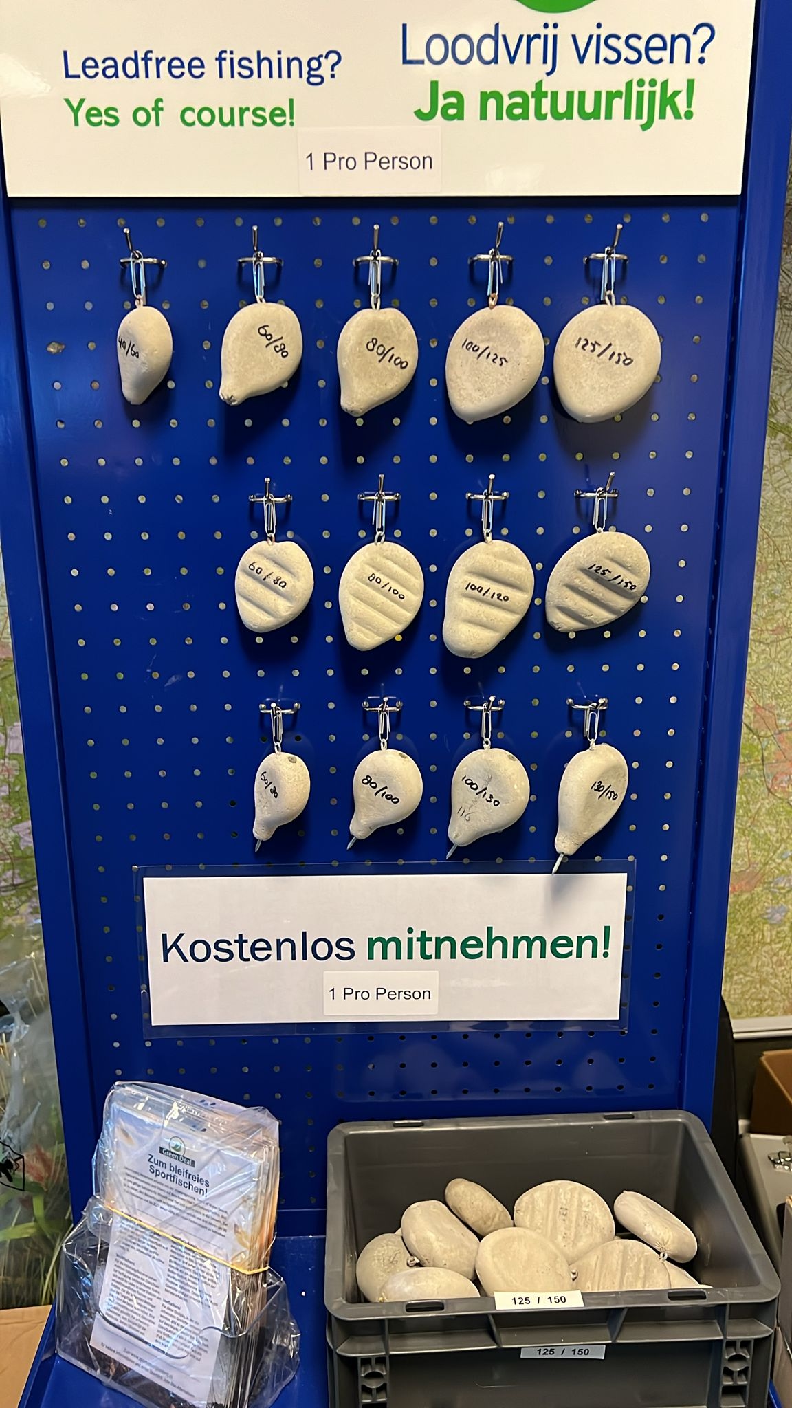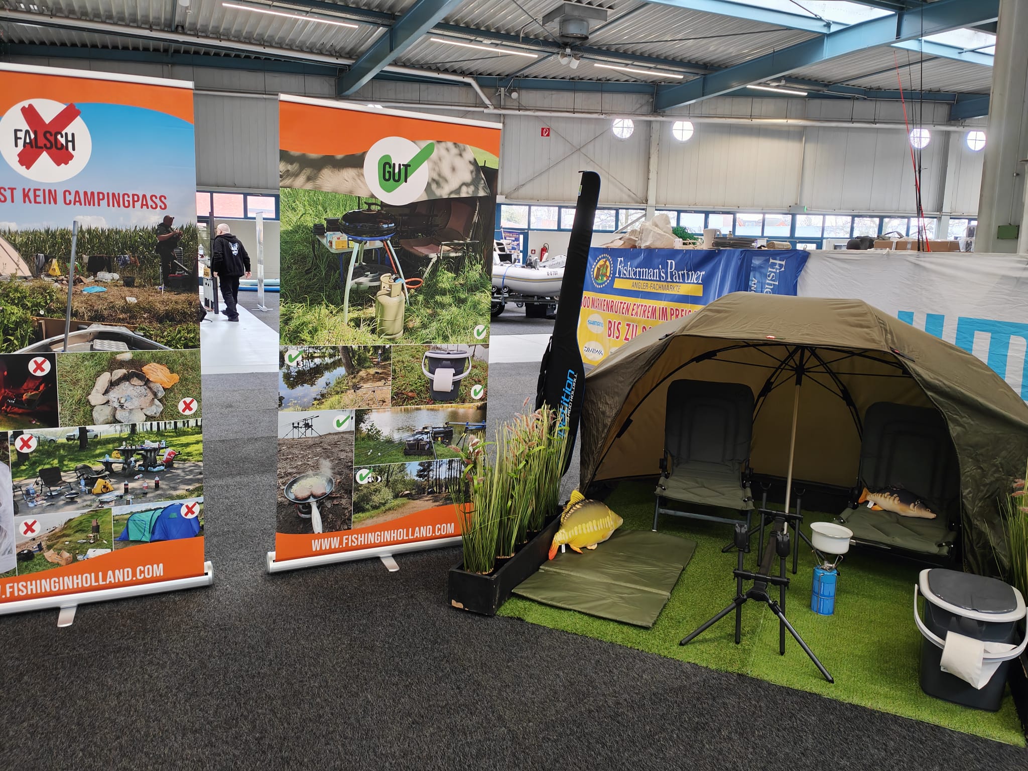 De stand was super netjes vormgegeven en zo stond er bijvoorbeeld een volledig ingerichte karperstek compleet met schuilmiddel, rodpot, poepemmer, stoelen, hengels, etc., etc. Die trok veel bekijks. Vele bezoekers van de stand werden verrast met de Duitse Snelstartgids voor de hengelaar en bijvoorbeeld de mooie sleutelhangers en 1 gratis loodvrij product. De aanwezige folders in de Duitse taal vonden gretig aftrek.