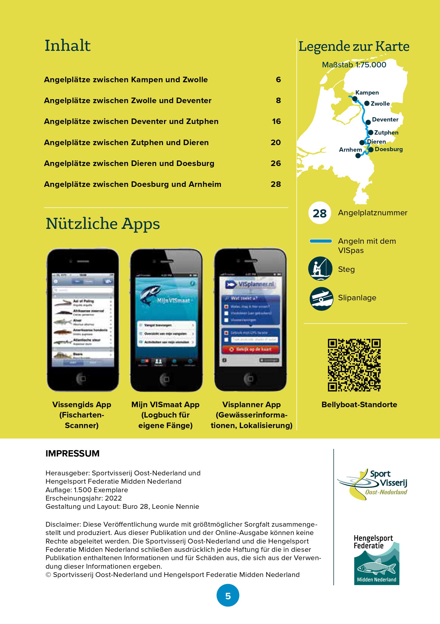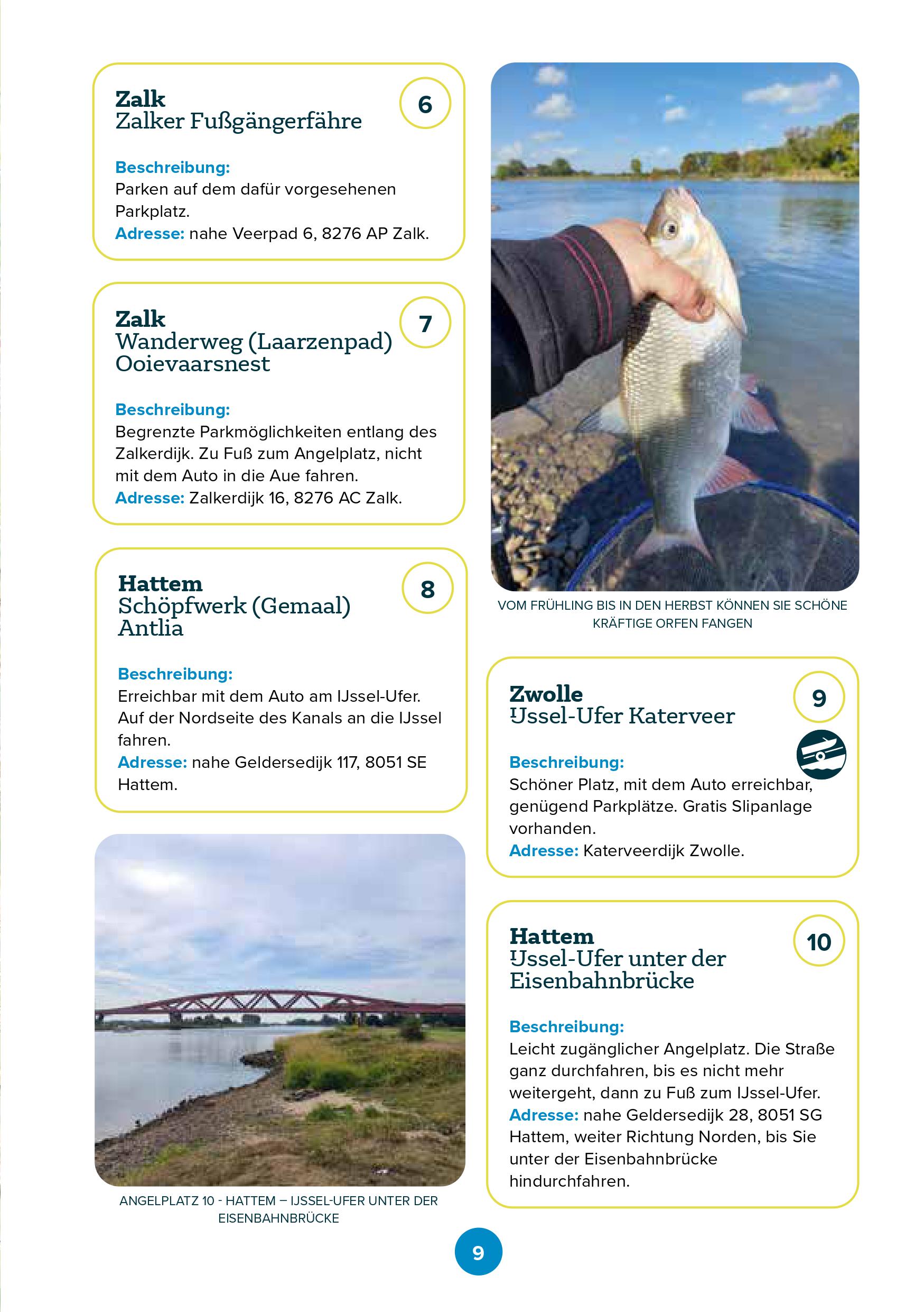 Letztes Jahr wurde die vollständig aktualisierte Ausgabe „Angelplätze entlang der Overijsselse / Geldersche IJssel veröffentlicht“. Dieses gibt es nun auch auf Deutsch. Beschrieben werden die schönsten und am besten erreichbaren Angelplätze von Kampen bis Arnheim, die mit den VISpas beangelt werden können. Dieses praktisches, vollfarbiges Buch enthält Teilkarten der IJssel sowie Ortsbeschreibungen. Die vielen farbenfrohen Fotos vermitteln ein schönes Bild der Umgebung und der Angelmöglichkeiten in der IJssel. Zusätzlich zu dieser physischen 30-seitigen Ausgabe ist auch eine digitale Version der Karte erhältlich.