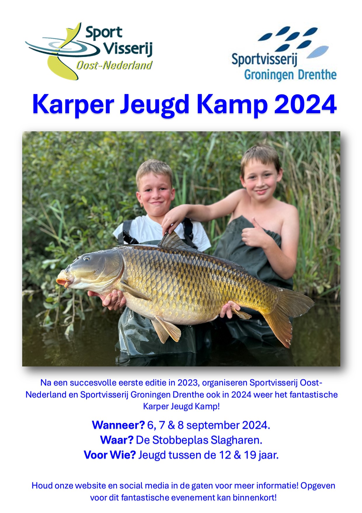 “Zoals reeds aangekondigd in de regio editie van het VISblad, organiseren wij samen met Sportvisserij Groningen-Drenthe het Karper Jeugd Kamp voor de 2e keer! Net als voorgaand jaar vindt ook deze editie plaats aan de Stobbeplas te Slagharen. Een water met een hoog bestand aan kleine(re) karpers waardoor de vangkansen hoog zijn. Ben jij tussen de 12 en 19 jaar en lijkt het jou leuk om samen met leeftijdgenoten en ervaren vissers de kneepjes van het karpervissen te leren? De inschrijving zal begin juni van start gaan, dus blijf onze social media en website in de gaten houden hiervoor!
