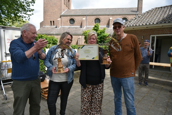 Om Lisette en Marianne extra in het zonnetje te zetten, overhandigden onze vaste vrijwilligers Vincent en Theo beide dames een vis sculptuur op een houten sokkel. Lisette ontving bovendien een oorkonde voor haar eigen 25-jarig jubileum.