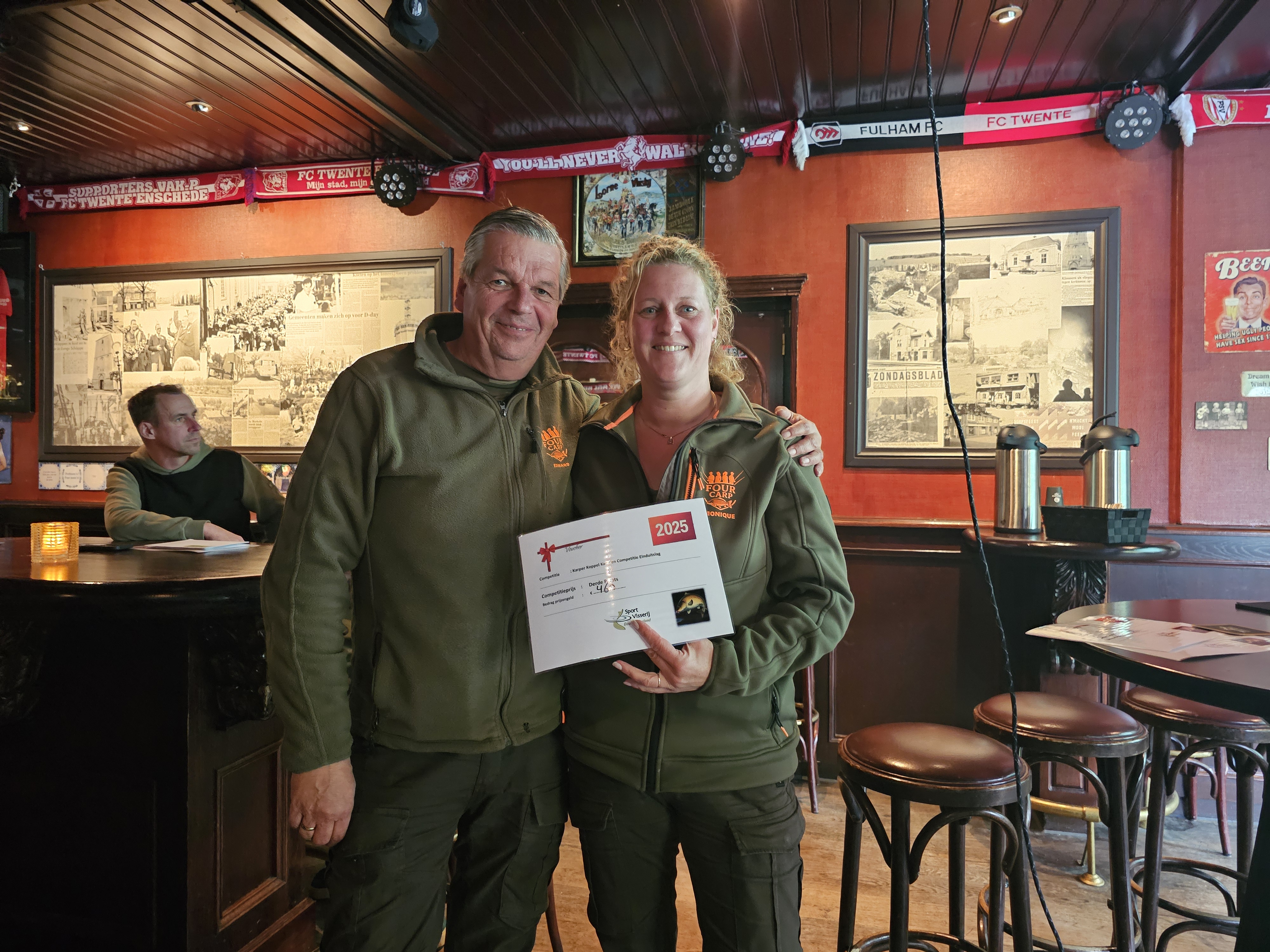 Zoals we het verslag net begonnen eindigde deze competitie aan de Schipbeek onder beroerde weersomstandigheden. Zaterdagochtend meldde een team zich met een karper, een oude spiegel van maar liefst 18,1kg! En daarmee ook meteen de zwaarste vis die gedurende deze hele competitie was gevangen. Omdat alle teams dicht bij elkaar zaten qua punten bleef het tot de laatste minuut vissen op het scherpst van de snede. Helaas bleven andere vangsten uit en was dit de enige gevangen vis. De deelnemers verzamelden zich rond 13:00 bij De Kroon in Markelo voor de prijsuitreiking die rond 14:30, na het opmaken van de prijzen, plaats vond. Rinus Klein van de wedstrijdcommissie nam het woord en verzorgde de prijsuitreiking.