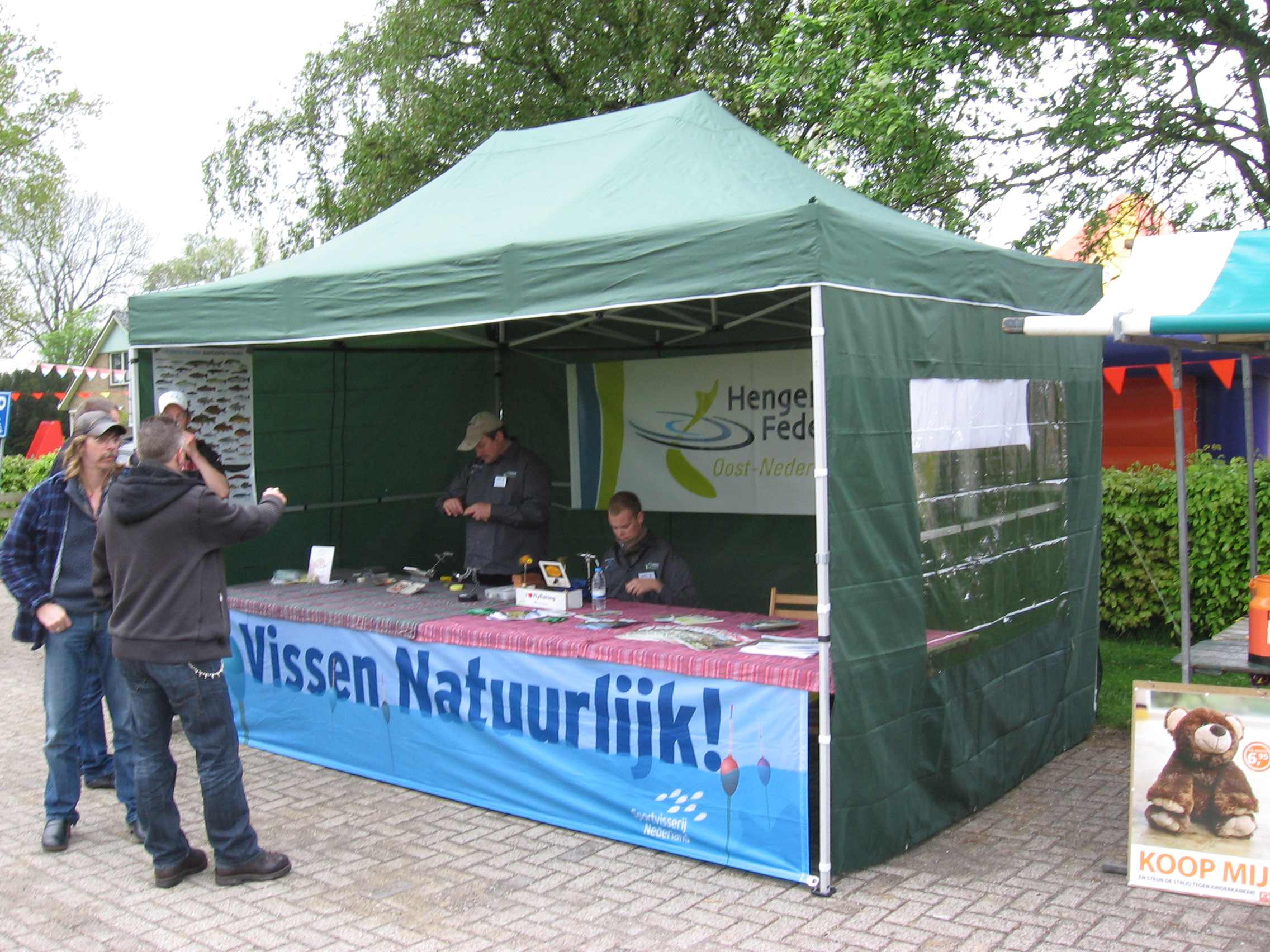 Om 9 uur zetten we onze tent op aan de Kerkwetering met uitzicht op, je raadt het al de Kerkwetering en de wijdse blik van de polder. De Hengelsport federatie Oost Nederland leverde de tent en de vliegvisclub The Kingfisher uit Kampen de bemensing. Een mooie samenwerking.