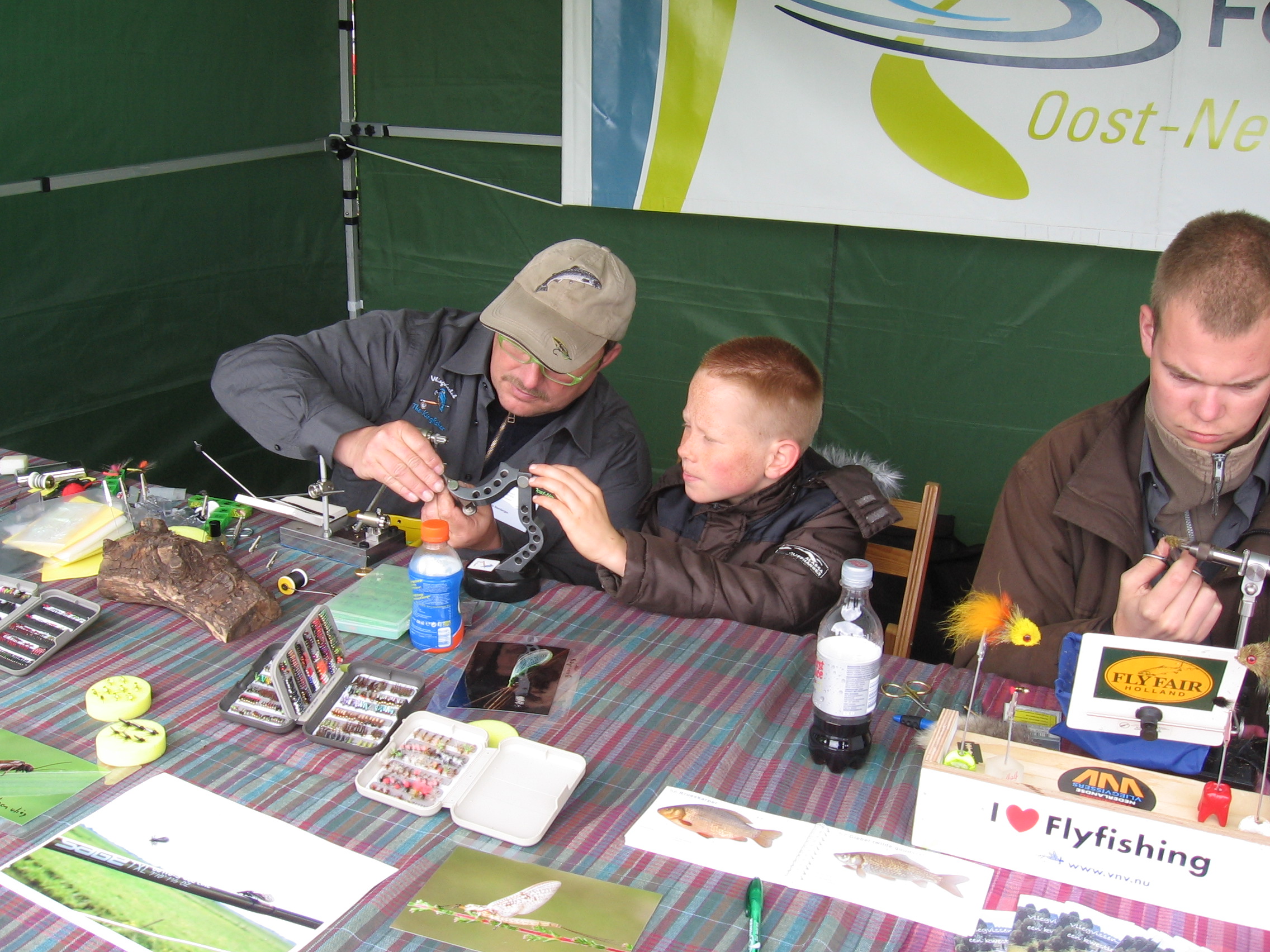 Vorig jaar is het me niet gelukt om een aanstormend jong vliegvis- en vliegbindtalent over te halen om een “vliegje” te binden. Deze keer zou het lukken dacht ik, maar de enthousiaste jongeling zou later die middag met z’n opa terug komen, aldus de toezegging van z’n moeder. Enige tijd later stond dezelfde jongeling weer bij de stand (overigens zonder opa). Zou hij gedacht hebben van nu of nooit. Nu zag ik de kans schoon. Plaatsje en materiaal geregeld en de moeder kon alleen maar toekijken hoe haar zoontje met de nodige trots en inspanning een “redtag nimfje” bouwde.
