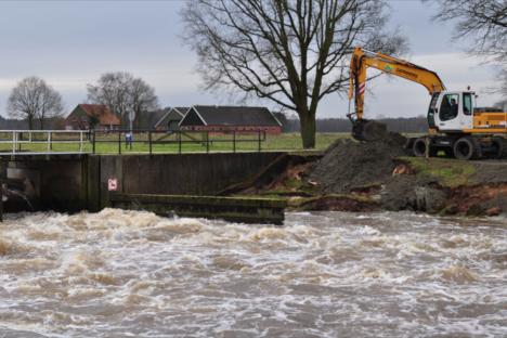 BEUNINGEN - Zoals in verschillende delen van ons land is ook in Beuningen overlast ondervonden van het hoge water, een gevolg van veel regenval en smeltende sneeuw. Afgelopen zaterdag werd de hoogwatersituatie dusdanig dreigend bij het omleidingskanaal in Beuningen dat de kanaaldijk dreigde in te zakken, omdat de stuw bij de Mensmanweg al het water niet meer kon verwerken. Met groot materieel werd zaterdagmiddag en -avond een waterkering opgeworpen door zand te storten.