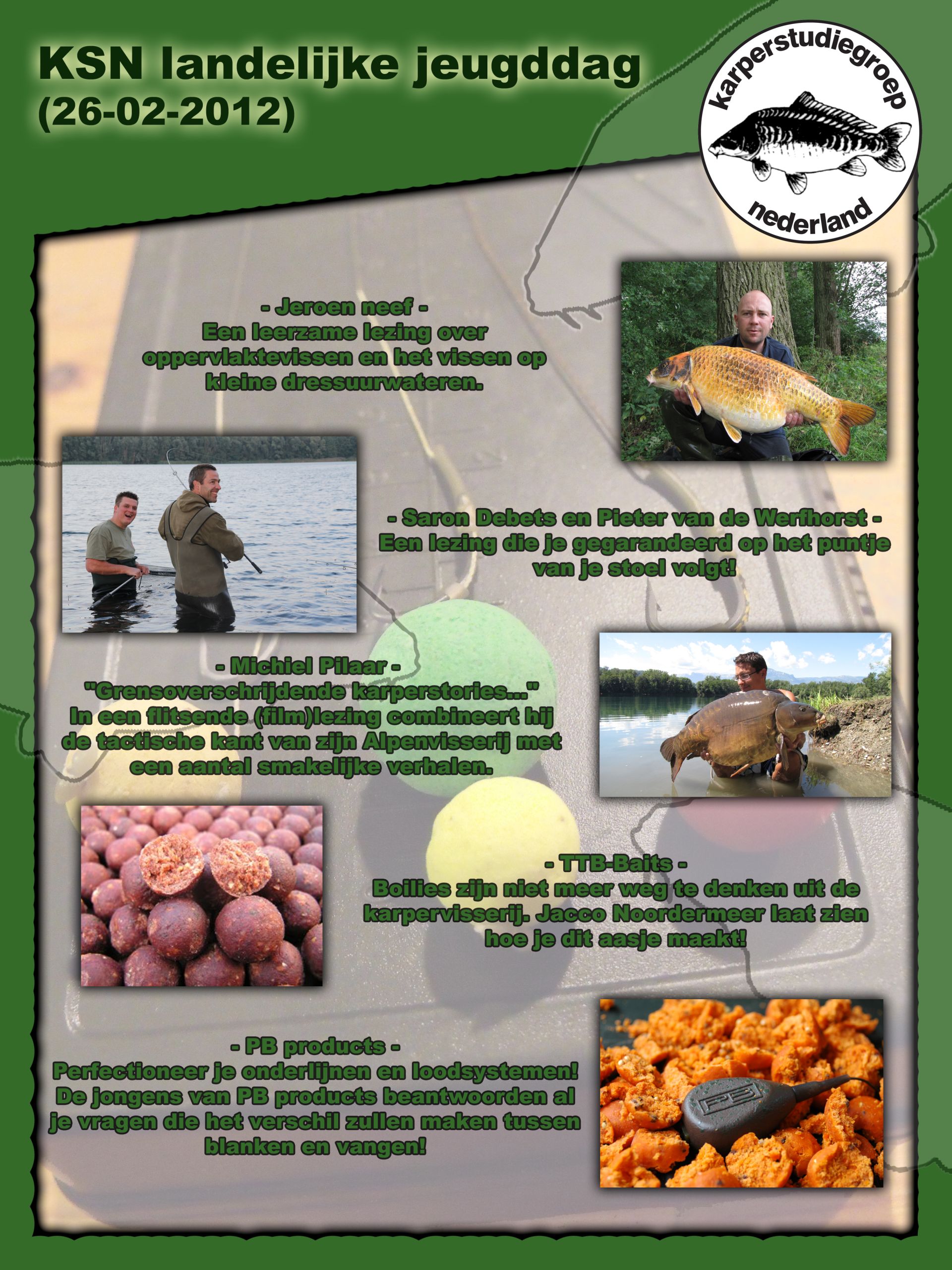 Op 26 februari 2012 organiseert de KSN commissie Jeugd weer een landelijke jeugddag. Vissers tot en met 20 jaar zijn welkom op deze leuke dag. Naast veel gezelligheid krijg je een aantal goede presentaties, workshops van echte karpercracks en maak je aan het einde van de dag kans op prachtige prijzen! De meeting is gratis bij te wonen en we kunnen jullie dan ook aanraden om deze dag zeker niet te missen!