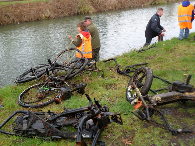 De buit was enorm in het Apeldoorn-Dierens Kanaal tussen de Marchantstraat en de spoorbrug! Brommers, fietsen, scooters, winkelwagens, verkeersborden, prullenbakken en zelfs een opengemaakte kluis werden boven water gehaald.