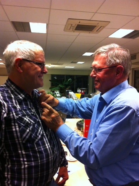 Maar daar bleef het niet bij! Ben is dit jaar ook nog eens 10 jaar bestuurslid in het Algemeen Bestuur van Sportvisserij Oost-Nederland. Tijdens de Algemene Bestuursvergadering van 1 november jl. werd Ben gehuldigd met de gouden erespeld en een mooi boeket bloemen. Een complete verrassing!