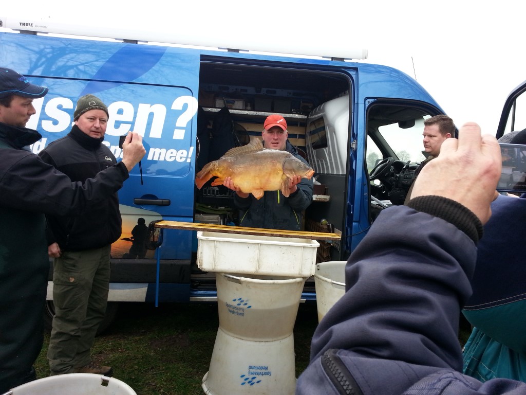 Snoek is er vandaag niet gevangen. Ook de vorig jaar uitgezette spiegelkarpers lieten zich helaas niet zien. Wel was het nog even genieten voor de aanwezige karpervissers: de vangst van de dag was een parel van een spiegelkarper van ruim 16 kg!