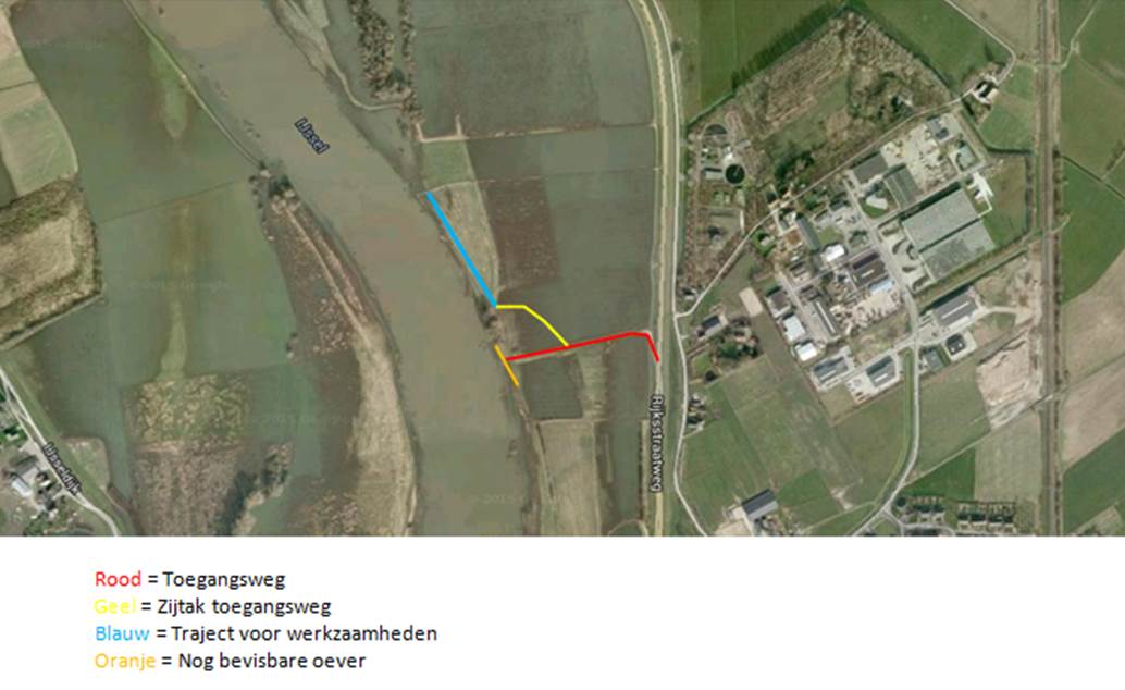 Op het traject voor de werkzaamheden wordt een dam c.q. verhoging van zo'n 3.5m breed en 1m hoog gerealiseerd. Deze wordt gemaakt van klei die verderop wordt gewonnen bij andere werkzaamheden. Tijdens de werkzaamheden wordt de toegangsweg (rood) gebruikt voor machines. Er is afgesproken dat de zijtak van de toegangsweg en daarmee een deel van de IJsseloever wordt afgesloten voor de duur van de werkzaamheden. De toegangsweg zelf blijft gewoon toegankelijk, hiermee zijn een aantal visstekken nog toegankelijk. Na de werkzaamheden verandert er niets voor sportvissers en is de IJsseloever weer gewoon bereikbaar.