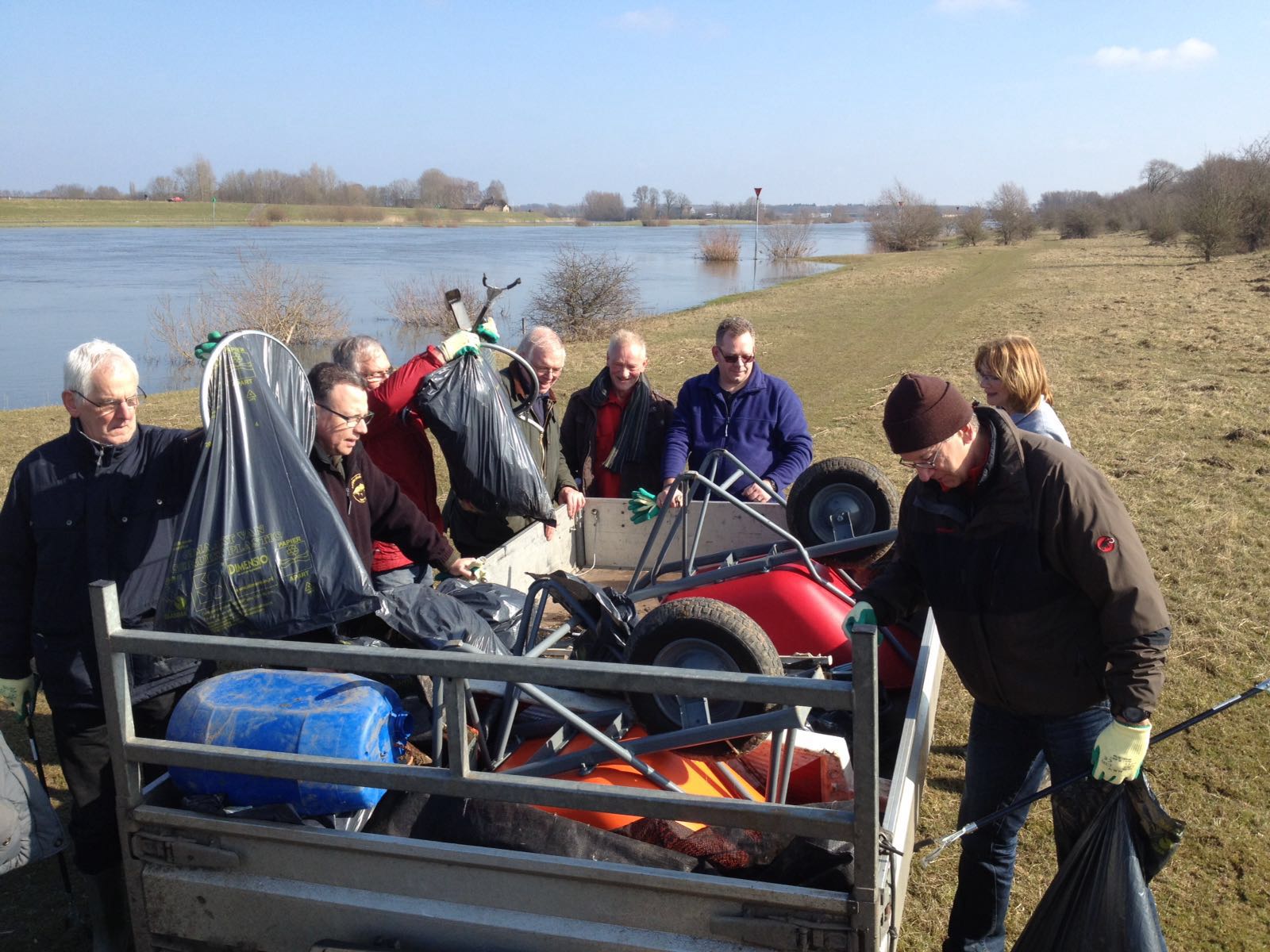 Vorige week stond de eerste opruimactie al gepland bij Heerde, maar vanwege de hoge waterstand in de IJssel kon deze actie niet doorgaan. Vandaag waren de omstandigheden optimaal en onder een stralende zon werden in totaal zo'n 15 vuilniszakken vol afval op de aanhanger geladen. Deze opruimactie is onderdeel van het project