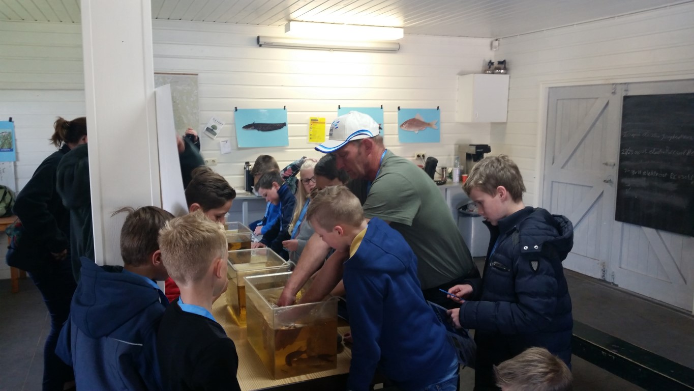 Na een korte en deskundige uitleg haastten de kinderen zich naar binnen, want hier stond de levende have opgesteld. Een aantal aquariumbakken met verschillende vissoorten die uit het gebied komen. Kers op de taart waren de kleine bittervoorns met zichtbare legbuizen. Marc had er een mooi verhaal bij met een grote zoetwatermossel die hij zelf had meegenomen.