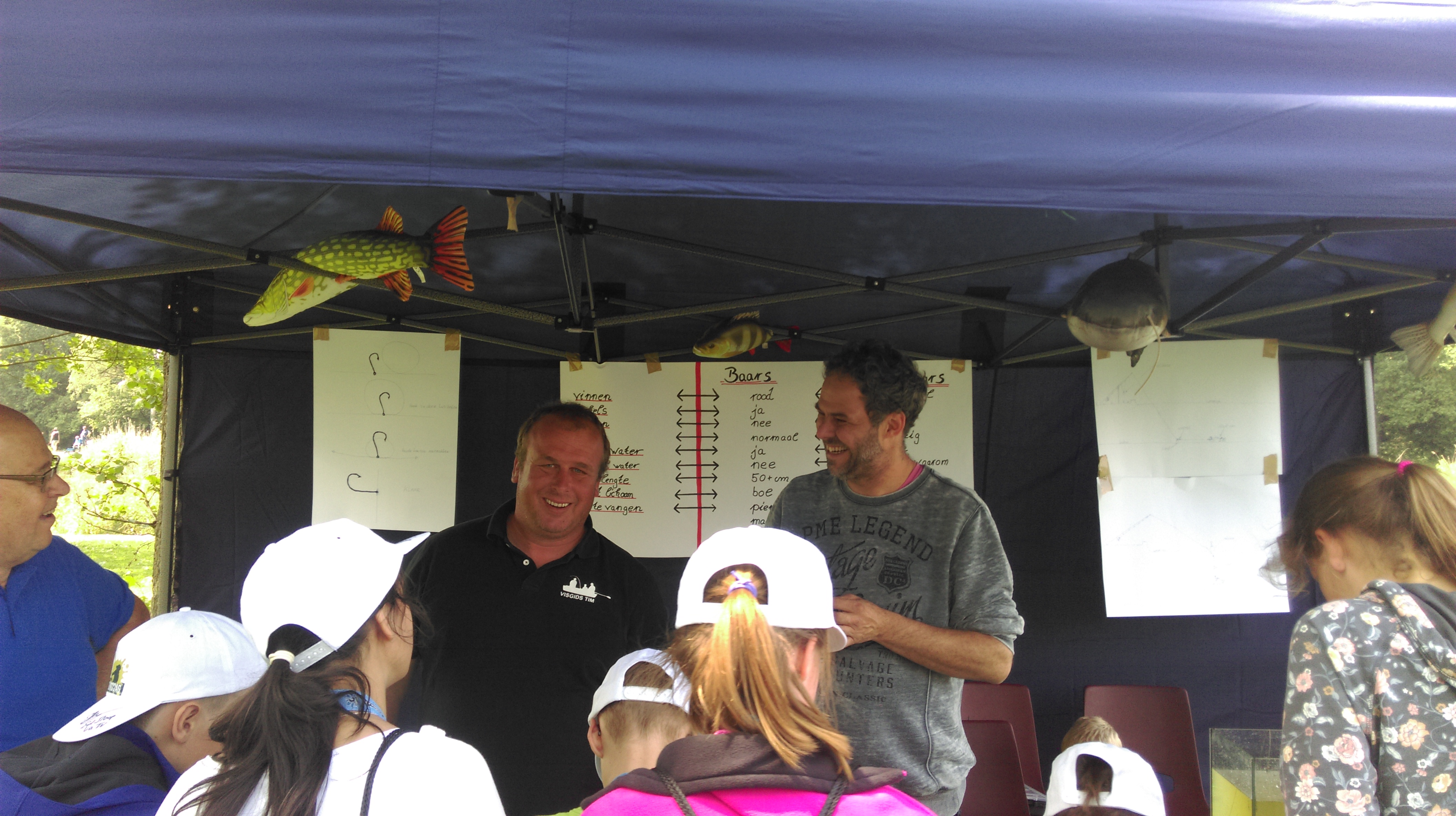 ’s Ochtends waren Anton en Mark al het water op geweest om met elektroapparatuur wat vissen te vangen. Deze vissen werden bewaard in aquaria voorzien van zuurstofpompjes om de vissen de hele dag in goede conditie te houden. Vismeesters Eef, Bé, Joop en Johan verzorgden als roulerend team deze vislessen via een presentatie. Daarna kregen de kinderen een mooie placemat met een zoekkaart “Vissen van sloot en plas” erop. Via de zoekkaart werd uitgezocht welke vissoorten er in de aquaria zwommen. Levende vis is voor kinderen toch altijd het mooiste wat er is! De meesten wilden wel even een vis vasthouden of aanraken.