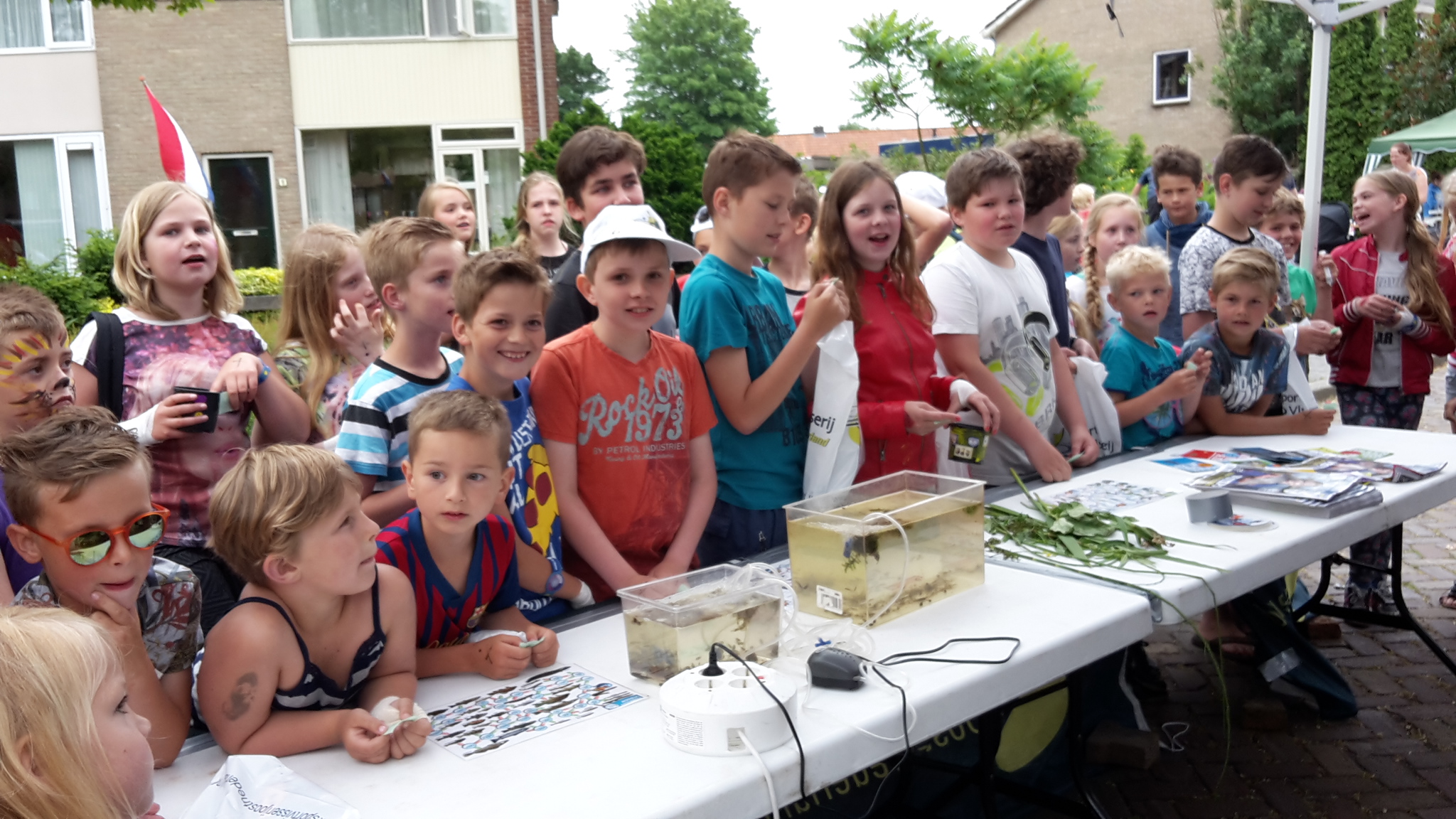 hsv het Snoekje uit Marknesse stonden onze vrijwilligers Theo, Vincent, Eef en Chris met onze federatiestand in het “speelcentrum” van Marknesse. Kinderen konden met zoekkaarten bekijken welke waterdiertjes en vissen er in de aquaria zwommen. Ook had Vismeester Eef wat planten uit eigen vijver meegenomen om daar uitleg over te geven. Zo’n 100 kinderen wisten onze stand te vinden en waren erg geïnteresseerd in het onderwaterleven.