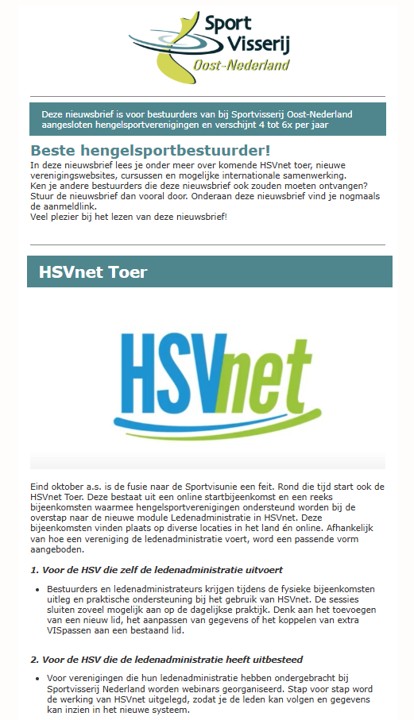Speciaal voor bestuursleden van onze aangesloten hengelsportverenigingen versturen we 4 tot 6 keer per jaar een digitale nieuwsbrief. Onderwerpen die aan bod zullen komen zijn o.a.: