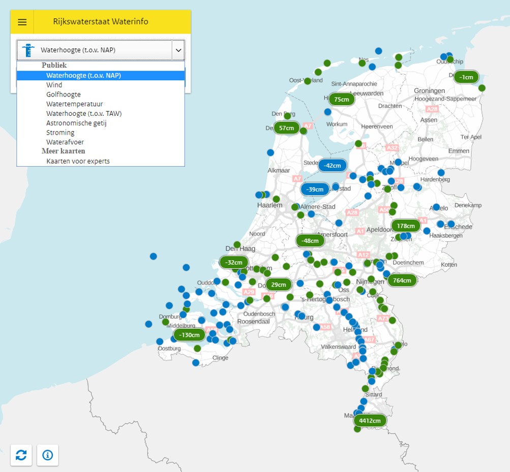 Rijkswaterstaat heeft een speciale website waarop middels een overzichtskaart met meetlocaties de waterhoogte (t.o.v. NAP) per stroomgebied bekeken kan worden. Elke meetlocatie kan aangeklikt worden, waarna meer details verschijnen.
